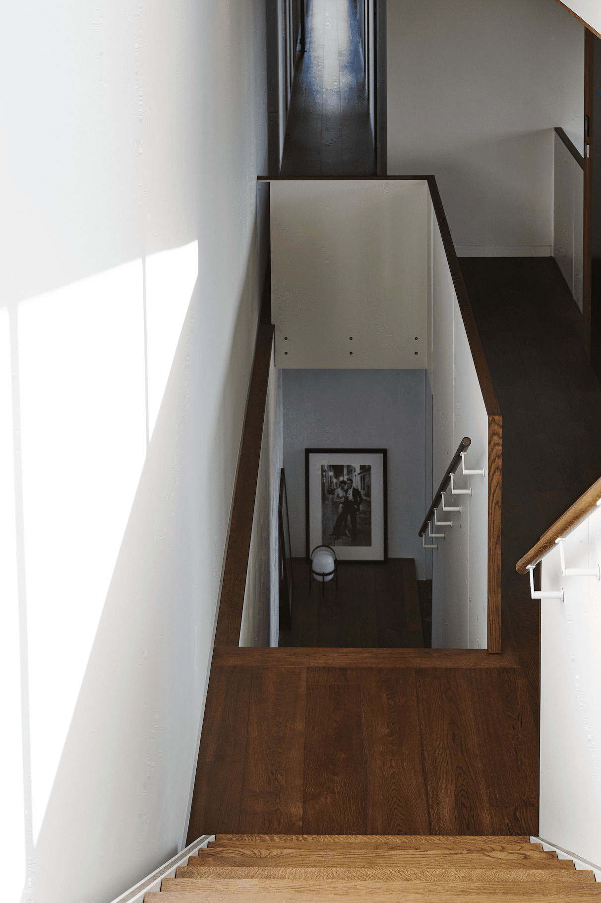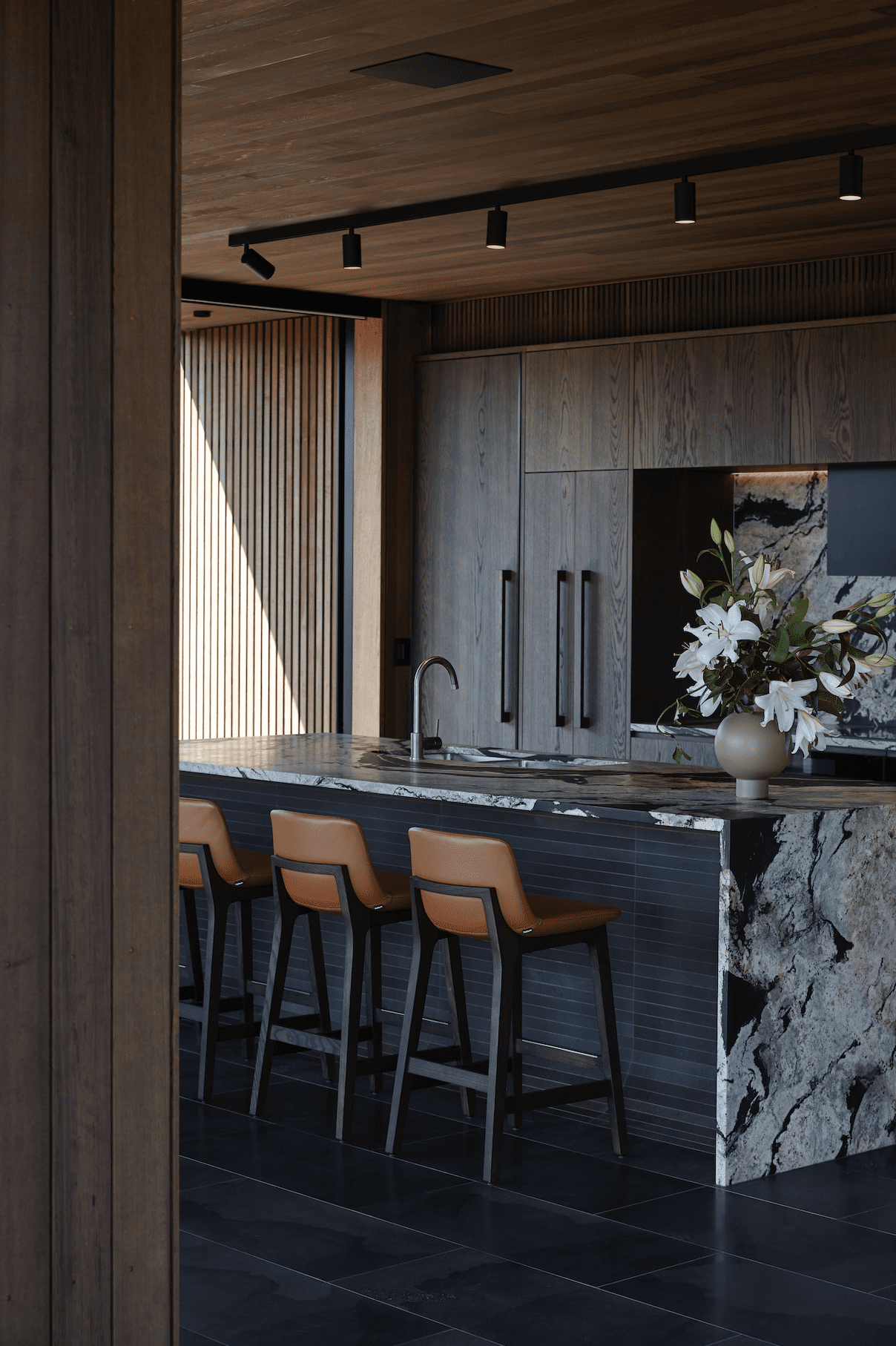 Internally, the home’s private spaces are flushed against the north while a set of white, epoxy-coated stairs defines the neighbour-facing end. The ground floor includes garaging and laundry room as well as a lift. The first floor is an open-plan social space defined by an incredibly detailed kitchen of dark timber — a combination of American oak and cedar — on the DBJ-manufactured cabinetry.