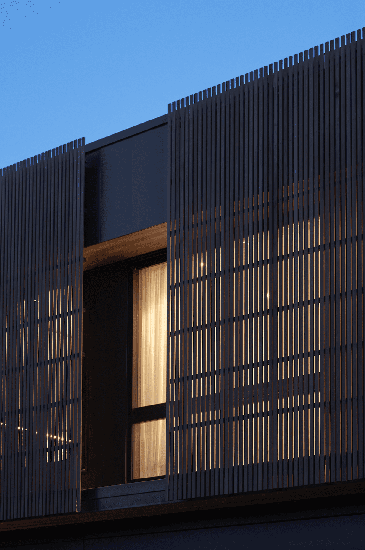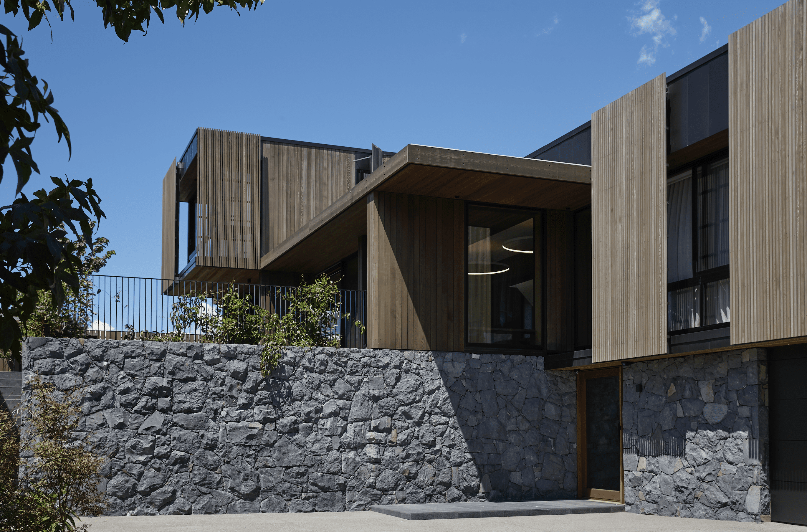 Perched above this solid mass is a more delicate affair of timber boxes, with another of the Herbsts’ recognisable features: timber slat screens.