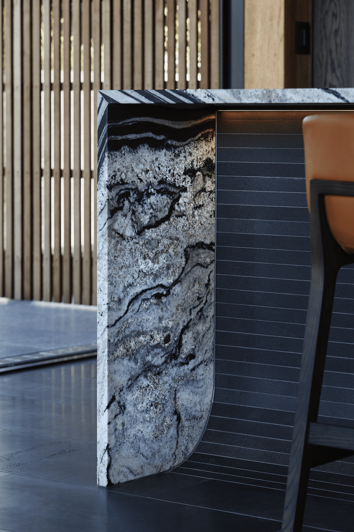The sculptural island includes a horizontally tiled, top-lit frontage that culminates in a stunning curvature as it flows onto the floor. The hero here — and throughout the house — is a Copacabana stone top: a dramatic, black-and-white Brazilian granite that is deep, moody, and full of detail.