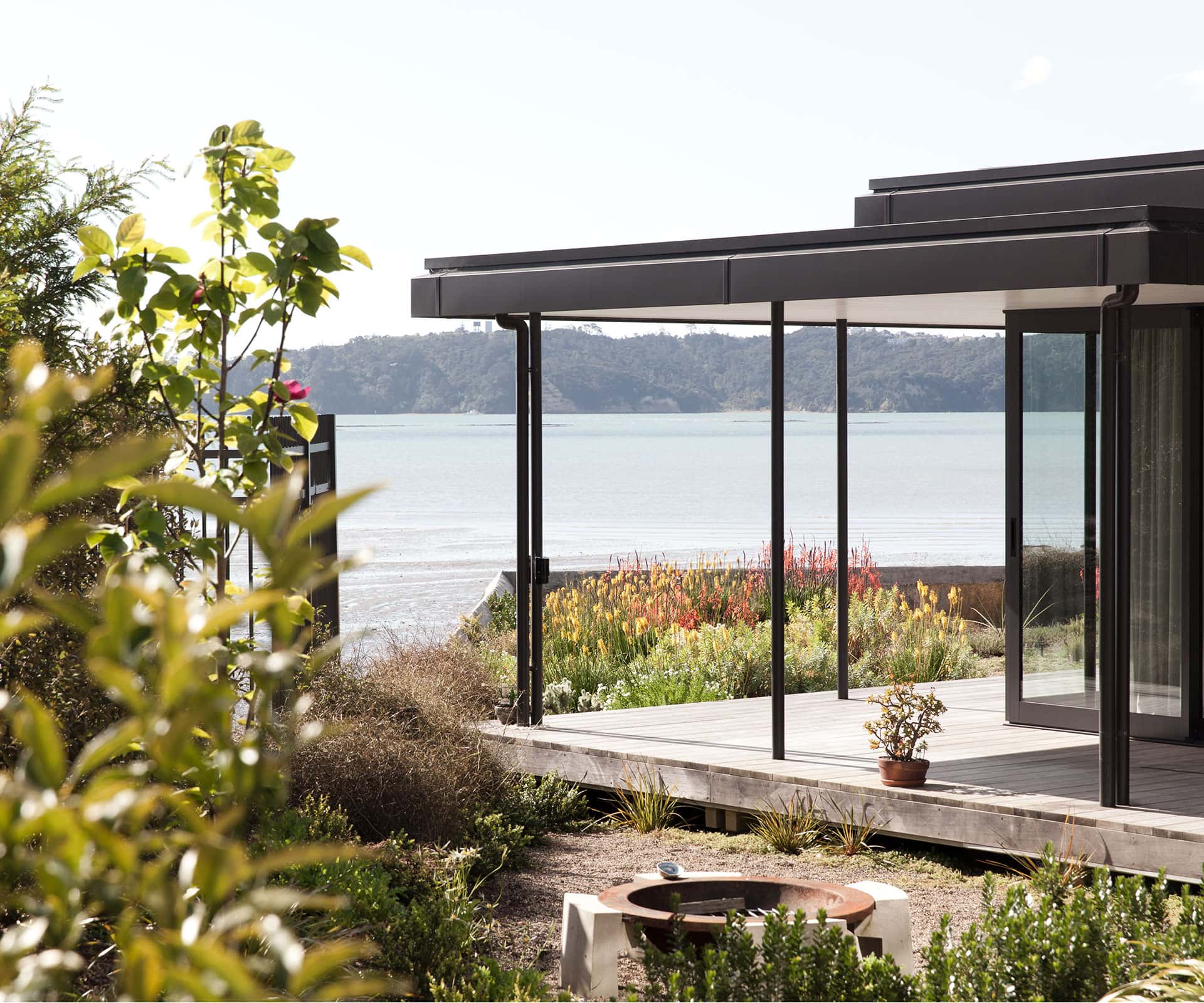 On a good day, the view stretches up the harbour to Hobsonville in one direction, and the Auckland Harbour Bridge in the other. On a wild day, the weather comes sheeting in; on a king tide, the surrounding land can be underwater. There are huge old pōhutukawa on a neighbouring property with their toes in the water, and an idyllic little beach.