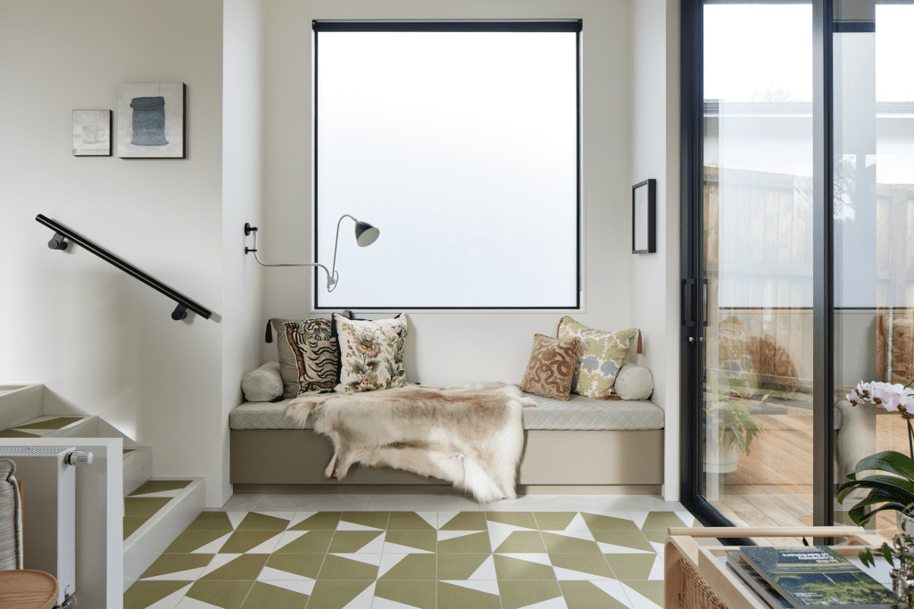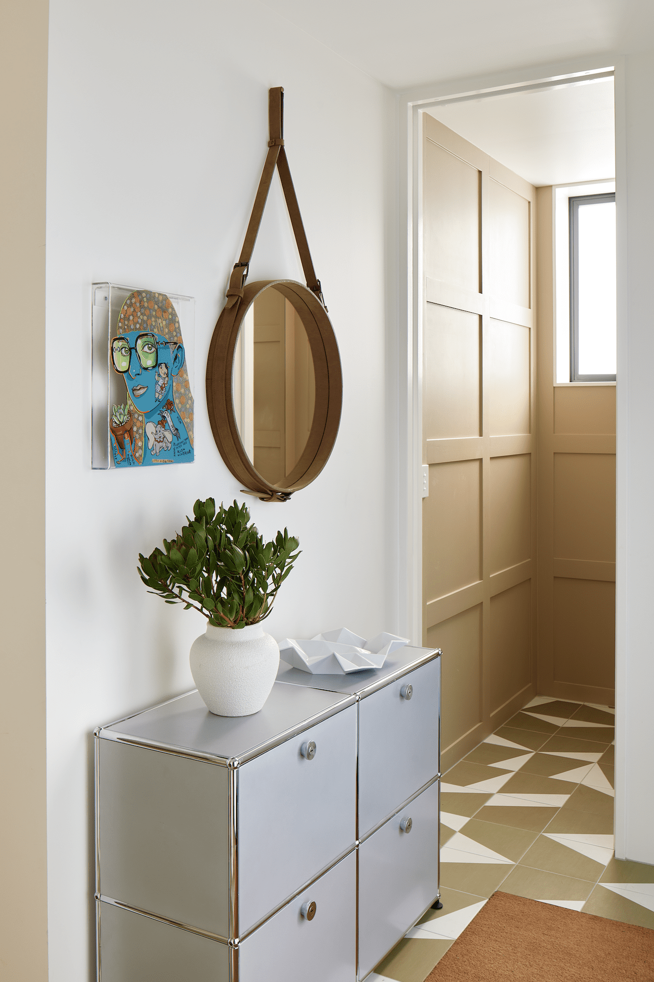 The chromatic fun starts in the entrance hall, where a haphazard olive-toned floor tile, aptly named Puzzle, is like a geometric river that flows through the plan.