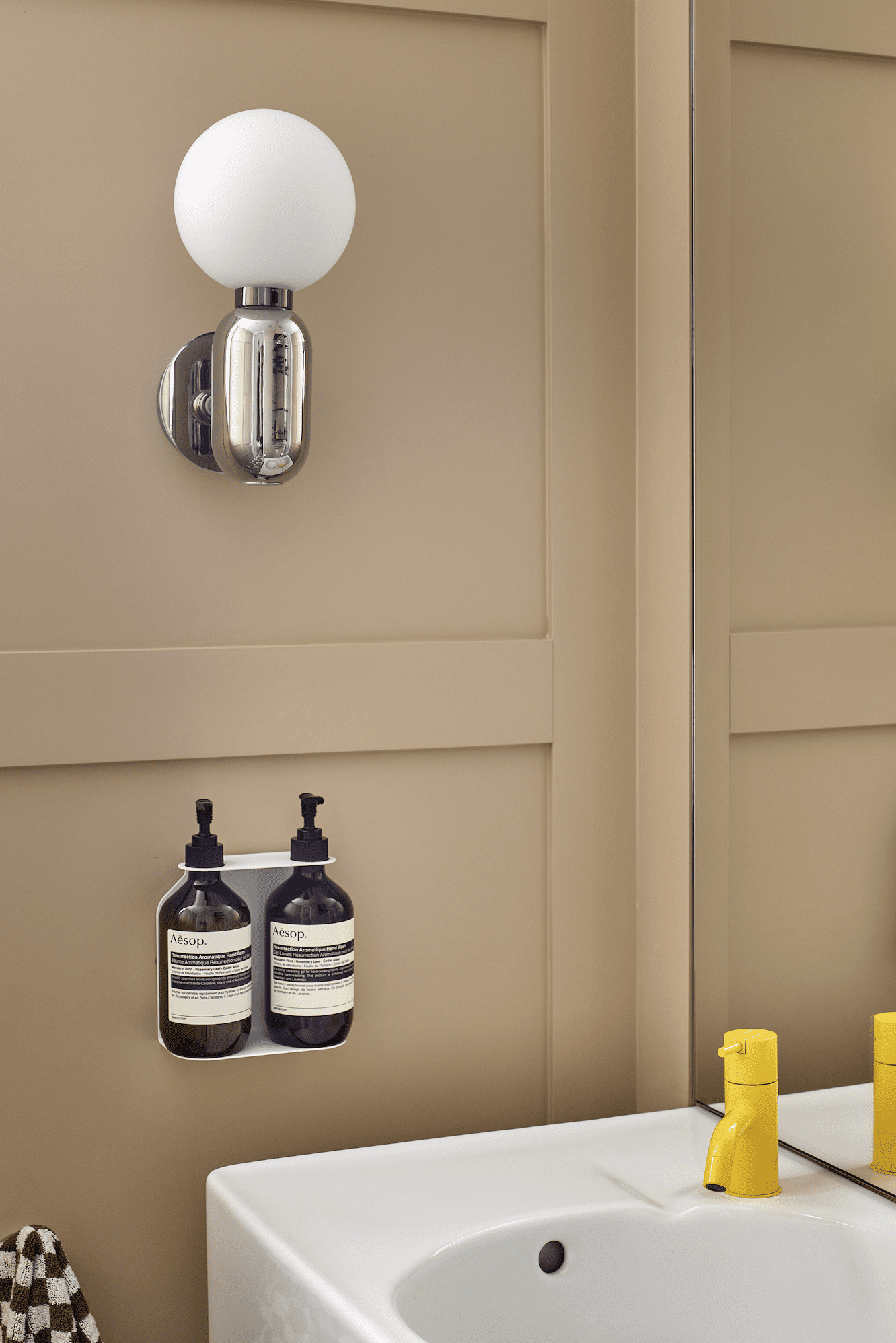 Alongside the separate snug — a favourite spot for snuggling up on the corner sofa for movie nights — the wall panels of the powder room are painted in Resene Desert Sand. This warm-caramel tone is a counterpoint to the Resene Pearl Lusta walls in the rest of the home. A bright yellow tap on the hand basin is echoed upstairs on the bedroom level, where the same taps, in a blue and dark blue version, are used in the family bathroom and main en suite.