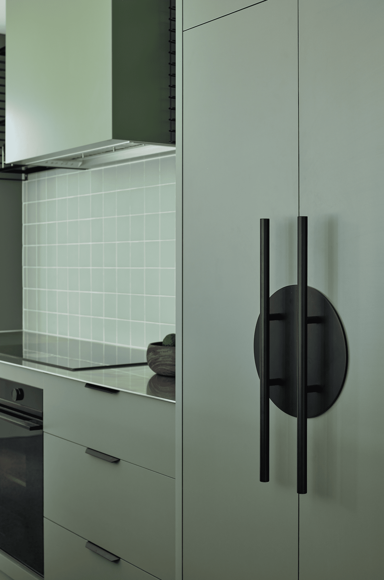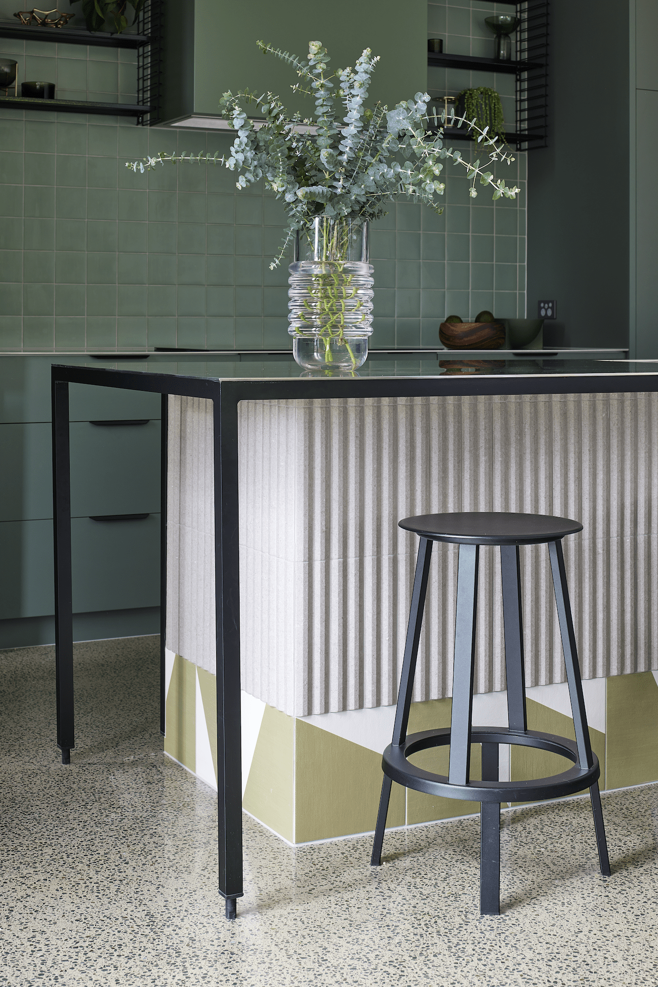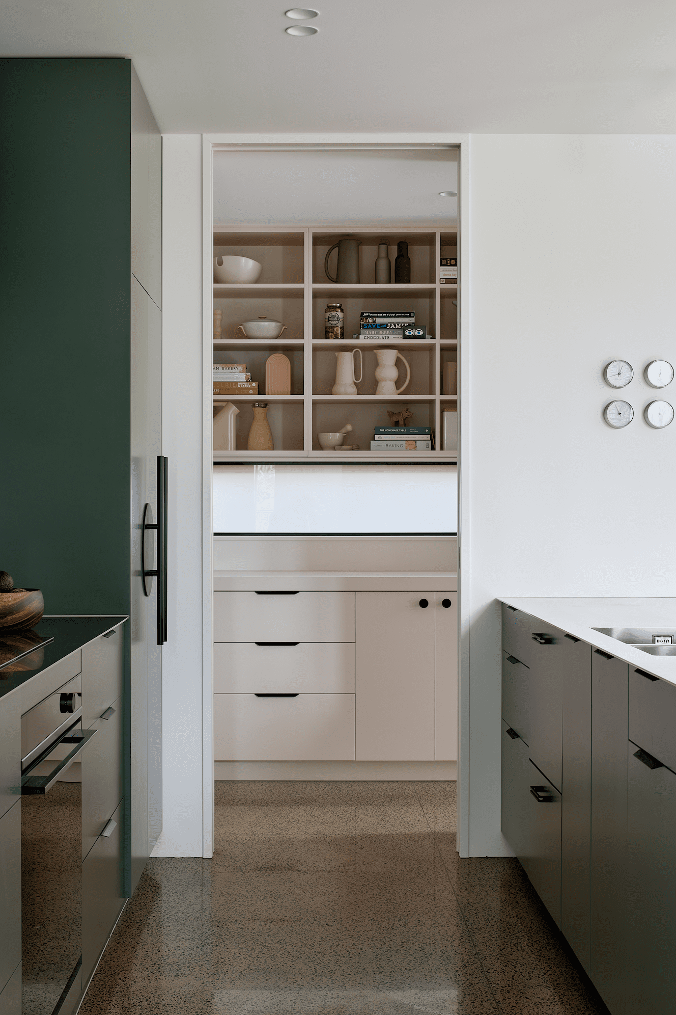 Teaming off-the-shelf slate-green laminate cabinetry and a tiled splashback in a similar green, it is a veritable shout-out to the power of this shade. A statement handle pastes a large black circle onto the ceiling-height pantry.