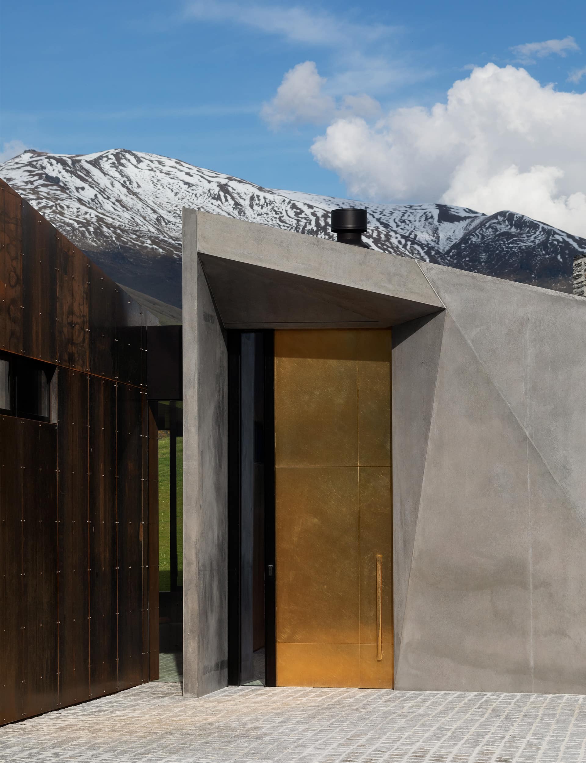 Come up the stone stairs and through the courtyard of this Arrowtown home, between buildings of schist and Corten steel, and a tall brass door is set into an angular concrete portal.