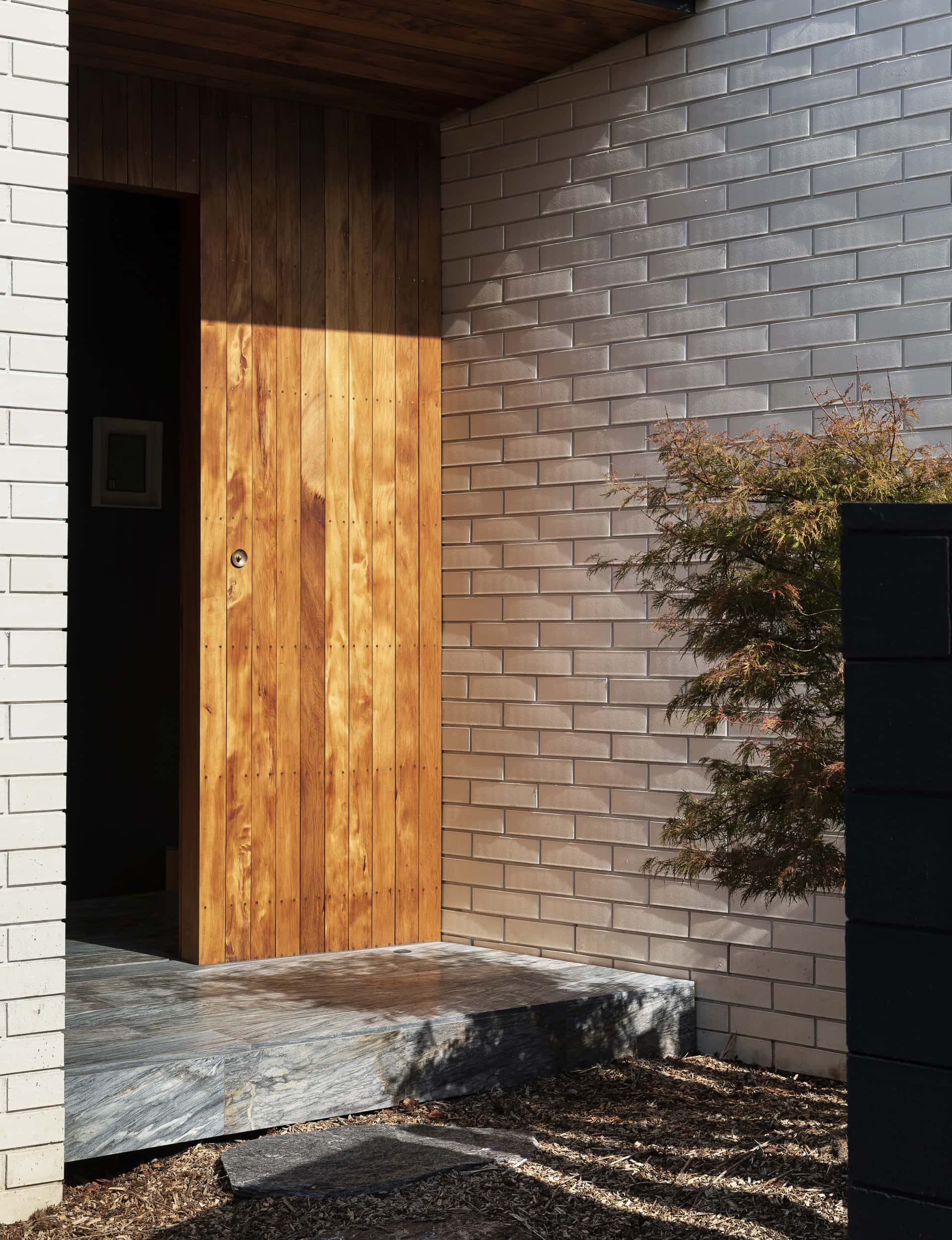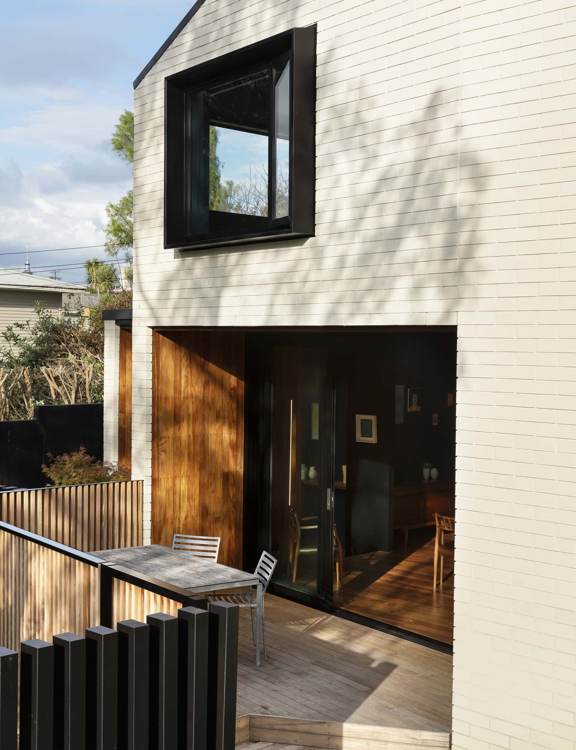 From the street, it has a withdrawn, even intriguing presence. Built from warm white bricks that catch the shadows, there’s an asymmetrical gable pulled down low and tight on one side, higher on the other, and punched out with deep-set black windows and timber reveals. The site feels public: there’s the driveway down the side, and the northern aspect faces the street. It’s not exactly forbidding, but there’s a sense of remove and restraint that is very deliberate – while the downstairs living areas run out to the front garden, the doors are set back inside timber reveals and the front wall is as high as they were allowed to build it.