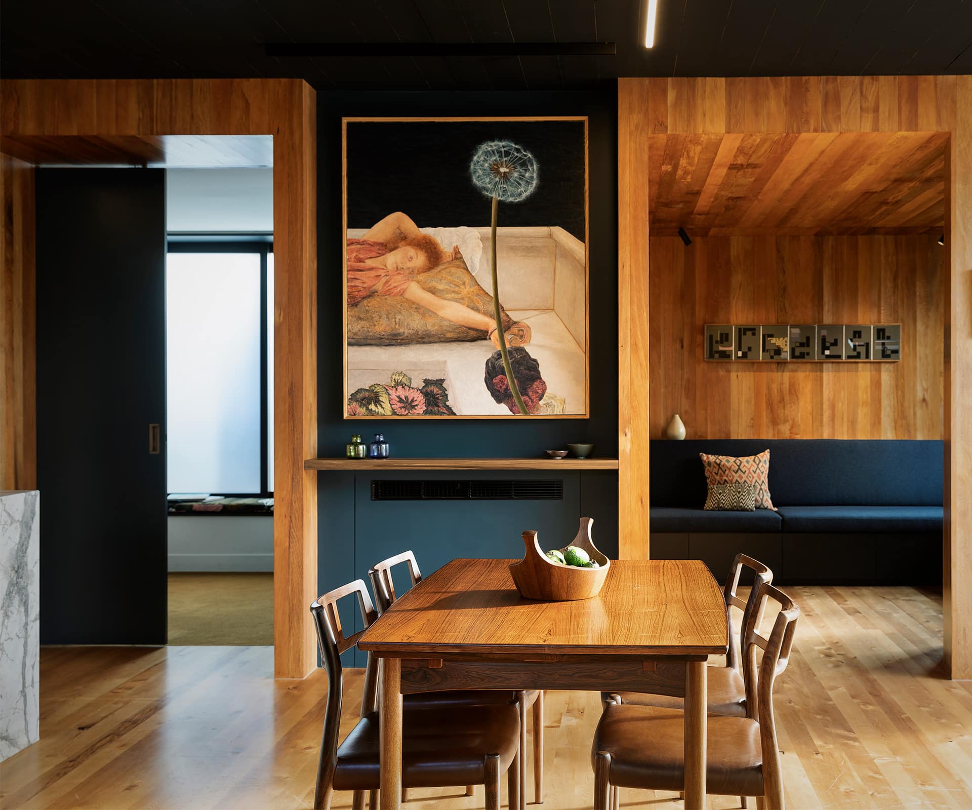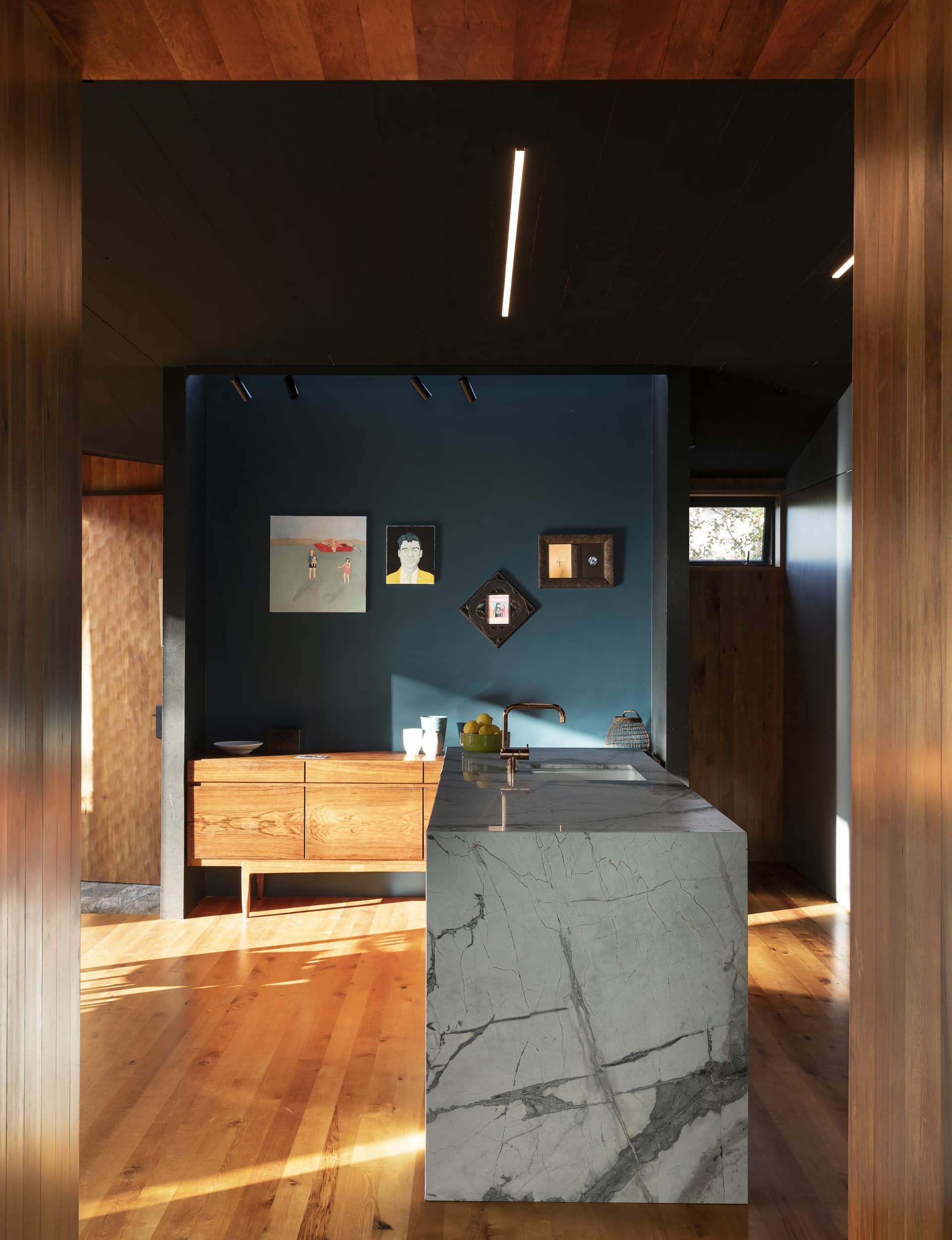For a moment, coming in from a bright Auckland afternoon through the timber-lined entry of architect Lisa Webb’s home, your eyes take time to adjust. Slowly, the house reveals itself as you round the corner – a black ceiling, rimu lining and dark blue walls come into relief. The effect is almost painterly, with the hues of an old Dutch master. Colours are warm and saturated. Shafts of light enter through deliberately placed windows and skylights, to exist as almost solid objects inside the space.