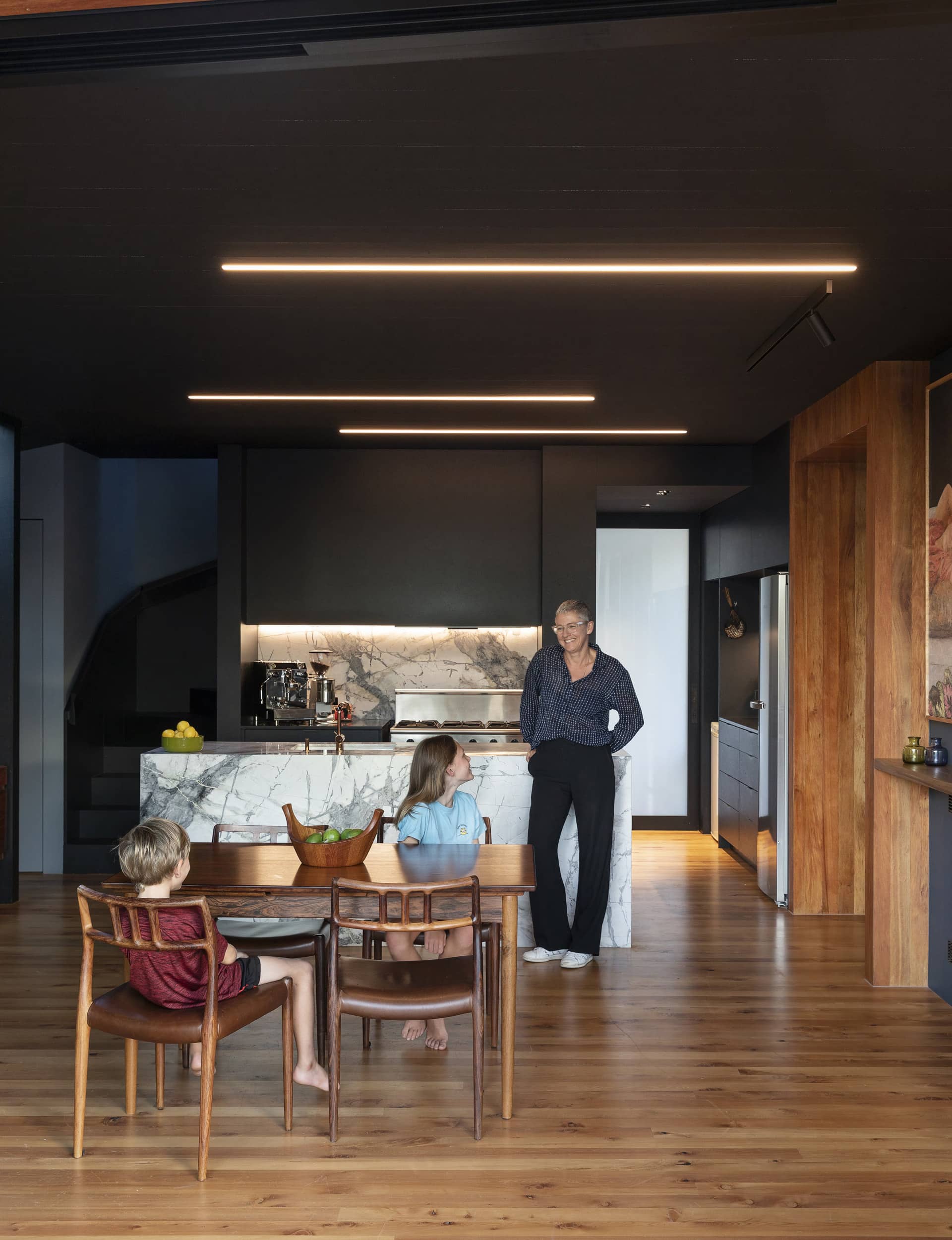 Downstairs: a kitchen-dining area, with black-painted Strandboard cabinetry and a black-painted cross-laminated timber ceiling that also forms the floor of the level above. This arrived in a day, cost less than other forms of construction, and, at 160mm thick, saved much-needed space in the tight design. To these humble materials – more often covered up with fancier finishes – Webb added a spectacular white-marble kitchen island.