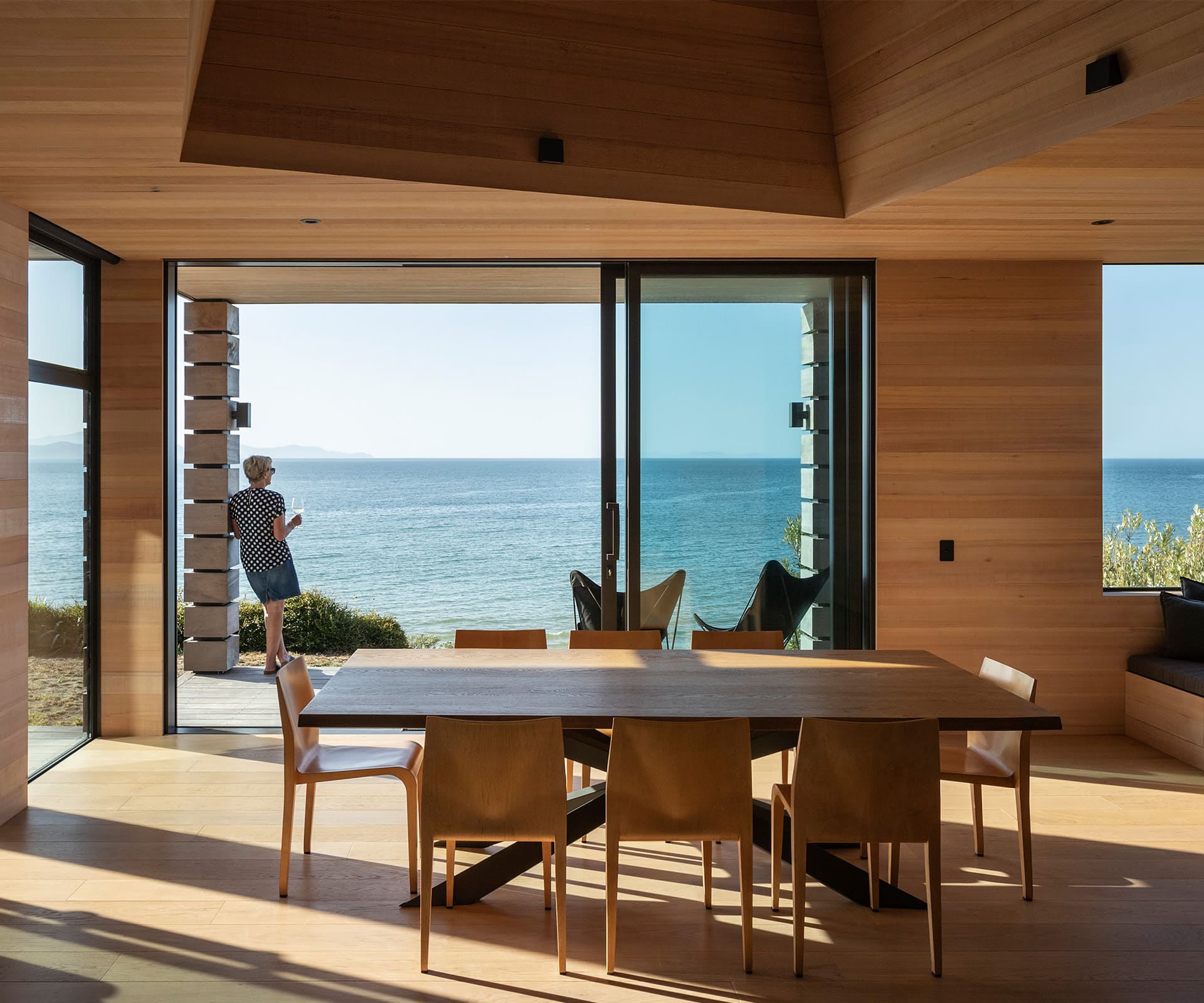 When you look back at the house from the beach, the sight is both expected and surprising. In common with many architectural holiday homes dotted around the country – including a few of Crosson’s previous works – the overall form is low and defined horizontally by natural materials. In this case, cladding formed of thick bands of reclaimed totara make for a home that sits staunchly and comfortably in its surroundings, mimicking the colour of the sand and the lines of grass.