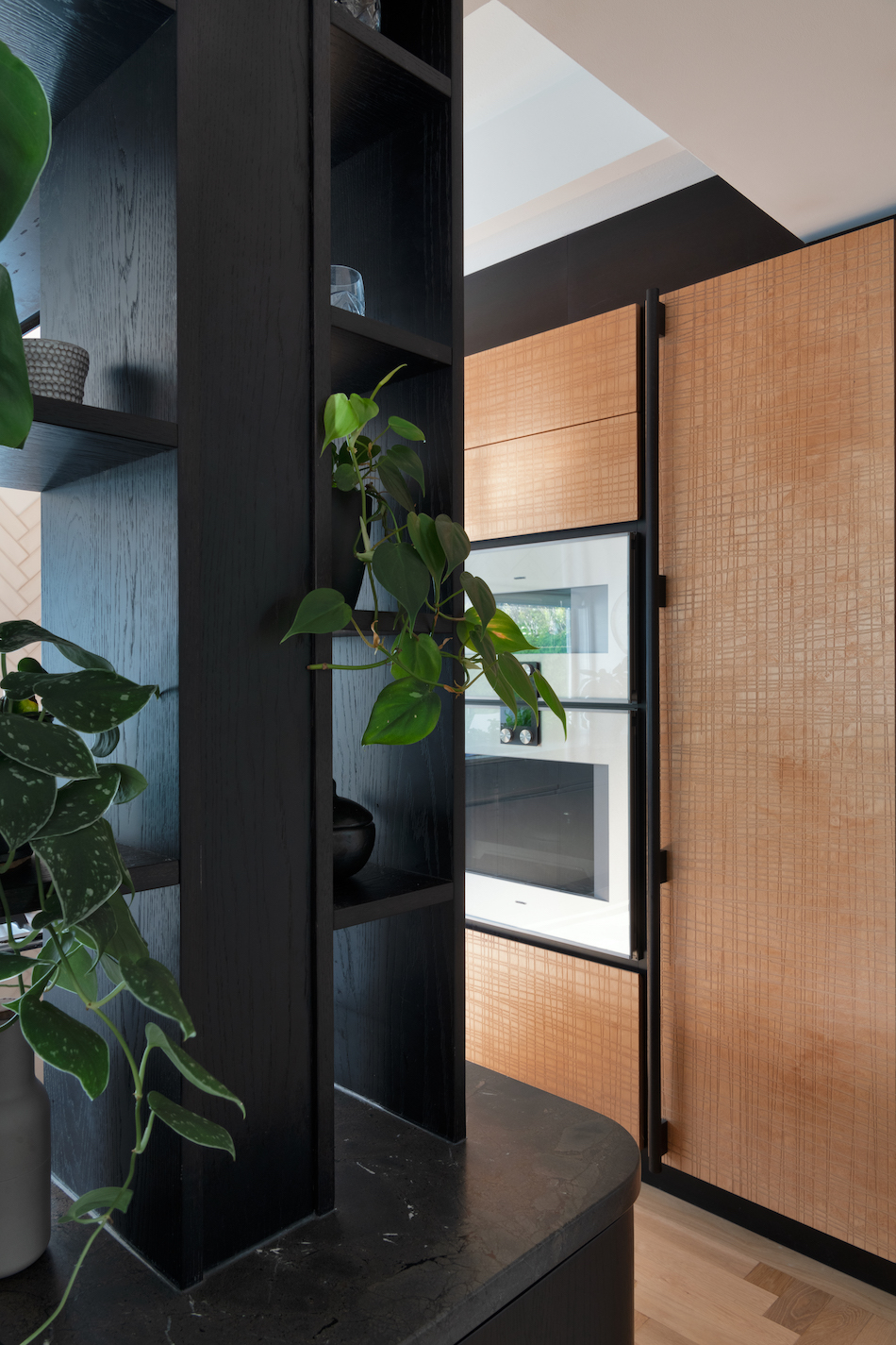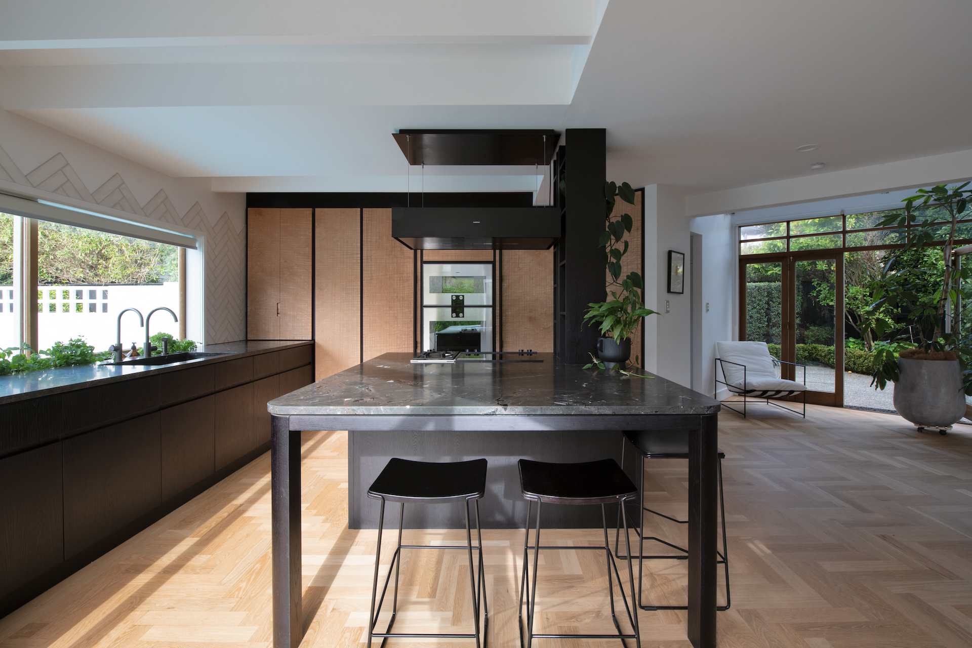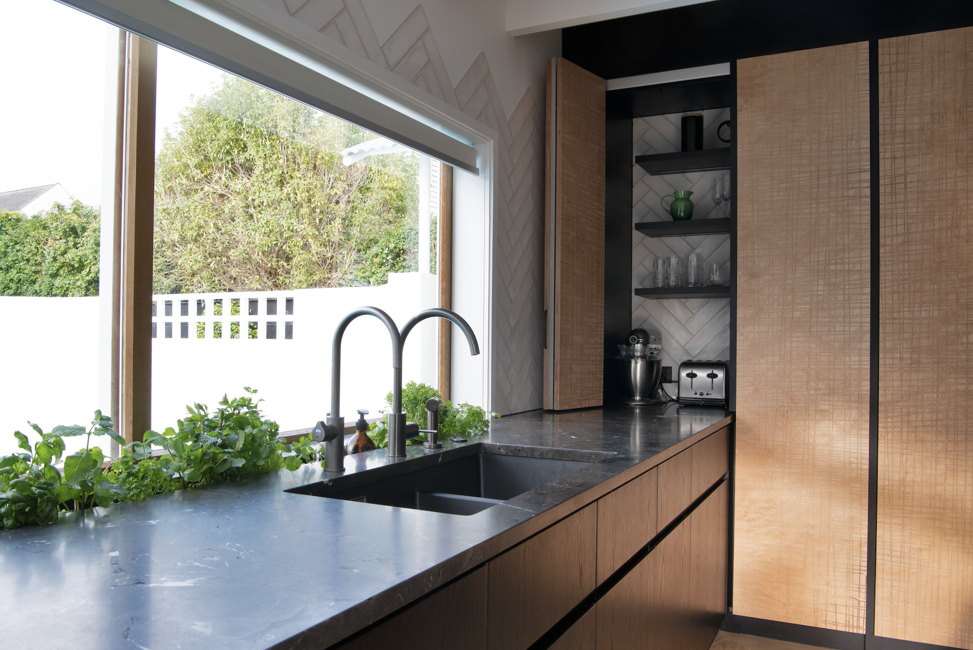 To work within these parameters, Kelly and Sean devised a spatial plan that would incorporate an L-shape around the structural pole, from which the floating rangehood appeared to cantilever out. Around the pole, a system of open shelving conceals the pole as a structural element. The patterns of the flooring were replicated in the wall tiling in its layout and peaked edges. The timber cabinetry repeats the patterned motif, uniting the geometries of the floor in a bespoke textural pattern inspired by the cuts left on timber by stone fabricators. Along the edge of the bench, the depth was widened to incorporate a herb planter running along the window sill, a biophilic element that draws on the greenery of the home’s extensive gardens.