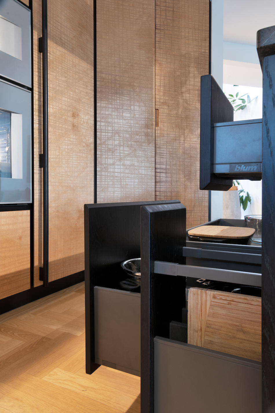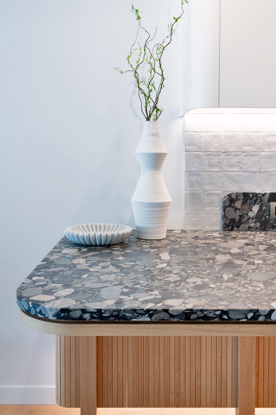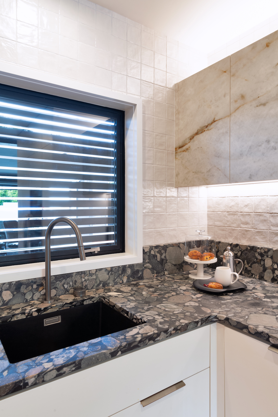 To work within these parameters, Kelly and Sean devised a spatial plan that would incorporate an L-shape around the structural pole, from which the floating rangehood appeared to cantilever out. Around the pole, a system of open shelving conceals the pole as a structural element. The patterns of the flooring were replicated in the wall tiling in its layout and peaked edges. The timber cabinetry repeats the patterned motif, uniting the geometries of the floor in a bespoke textural pattern inspired by the cuts left on timber by stone fabricators. Along the edge of the bench, the depth was widened to incorporate a herb planter running along the window sill, a biophilic element that draws on the greenery of the home’s extensive gardens.