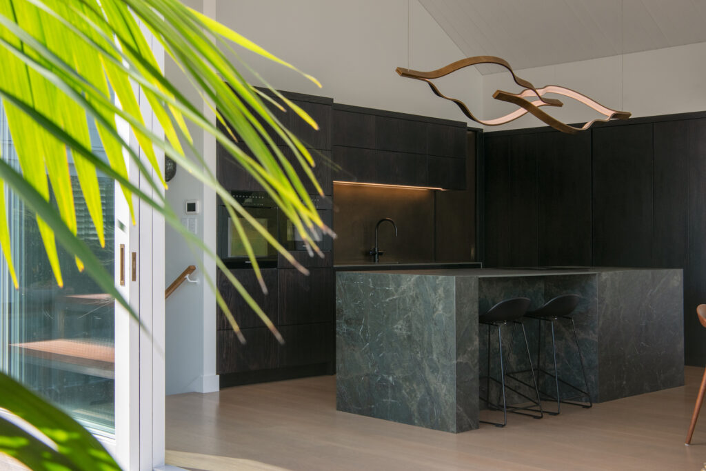 The main kitchen is anchored by a Neolith Amazonica stone island in which deep emerald tones are incorporated and behind which black cabinetry exerts an elegant moodiness within the open-plan space.