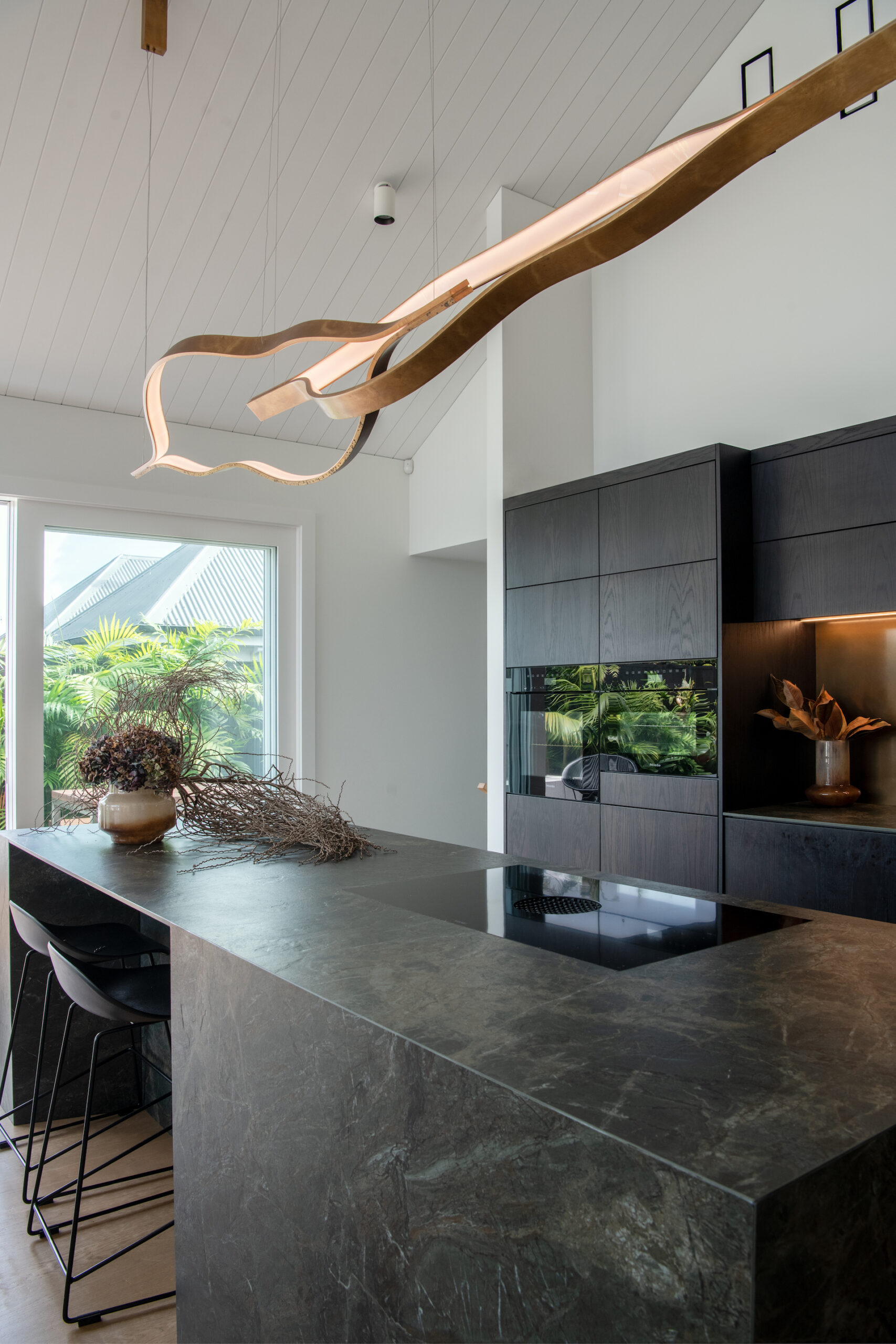 The splashback is in aged brass, linking to the sculptural light above the island; both alluding to the movement of water in the outdoor pool onto which the kitchen looks. In the pool-house kitchen, the dark tones are continued with the Neolith stone repeated.