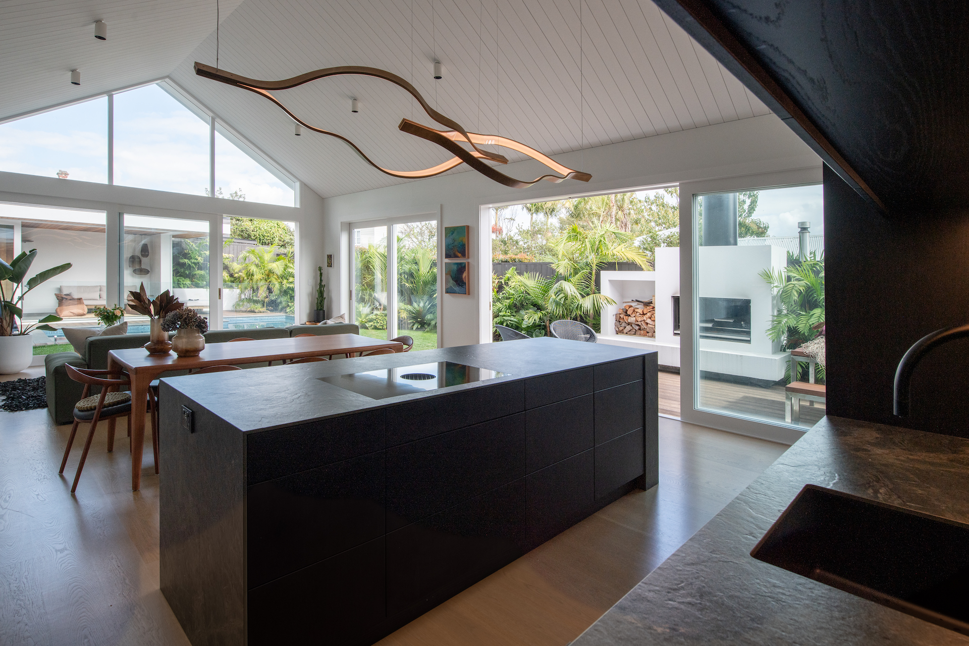 “We wanted this kitchen to become a design element within the living area, which was the driver for handleless cabinetry and integrated appliances here. The Bora induction hob on the island has a self extraction system, allowing for a light feature to be installed above instead of the usual requirement for a rangehood,” Kelly explains.