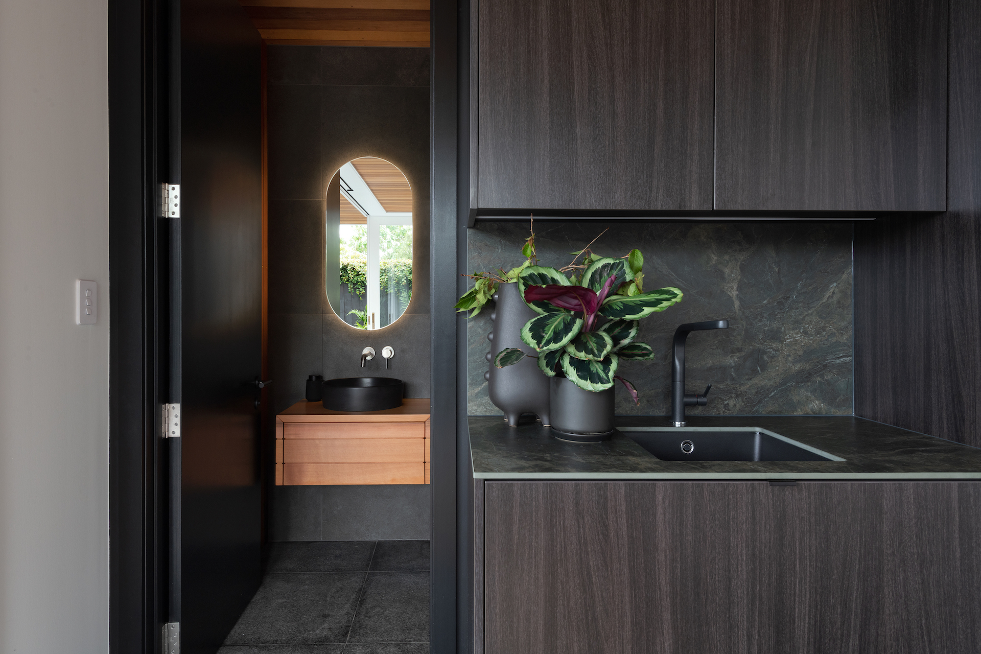 CDK Stone’s leathered Nero Marinace granite was chosen as a centrepiece, a material that Kelly and Sean had only seen used with a glossy finish. Here, it is leathered and becomes a highly textural focal point for the space. Corners are rounded and its curvature allows for an openness in the tight space.