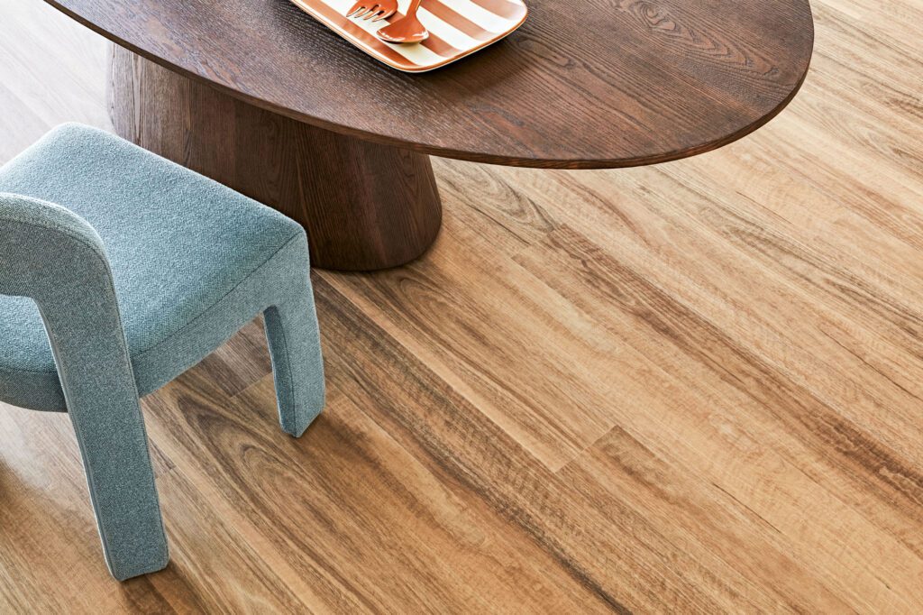 In the dining area, this dialogue continues. Earthy brown tones temper the livelier hues, introducing an organic warmth that enriches the palette and adds subtle vintage resonance. The space is grounded by Aquila Acoustic Vinyl Plank flooring in Classic Blackbutt 545 by Godfrey Hirst, its cool, contemporary oak tone offering a durable and elegantly restrained counterpoint.