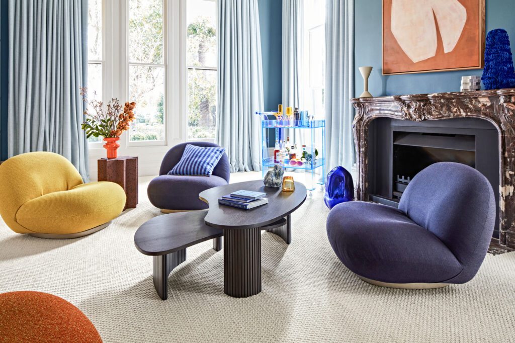 Against this tactile base, deep blocks of blue establish a sense of calm structure. These classic, saturated tones lend order and permanence, creating a steady backdrop for moments of brightness — a sculptural chair, a vivid accent, a considered flourish of colour — that animate the space without overwhelming it.