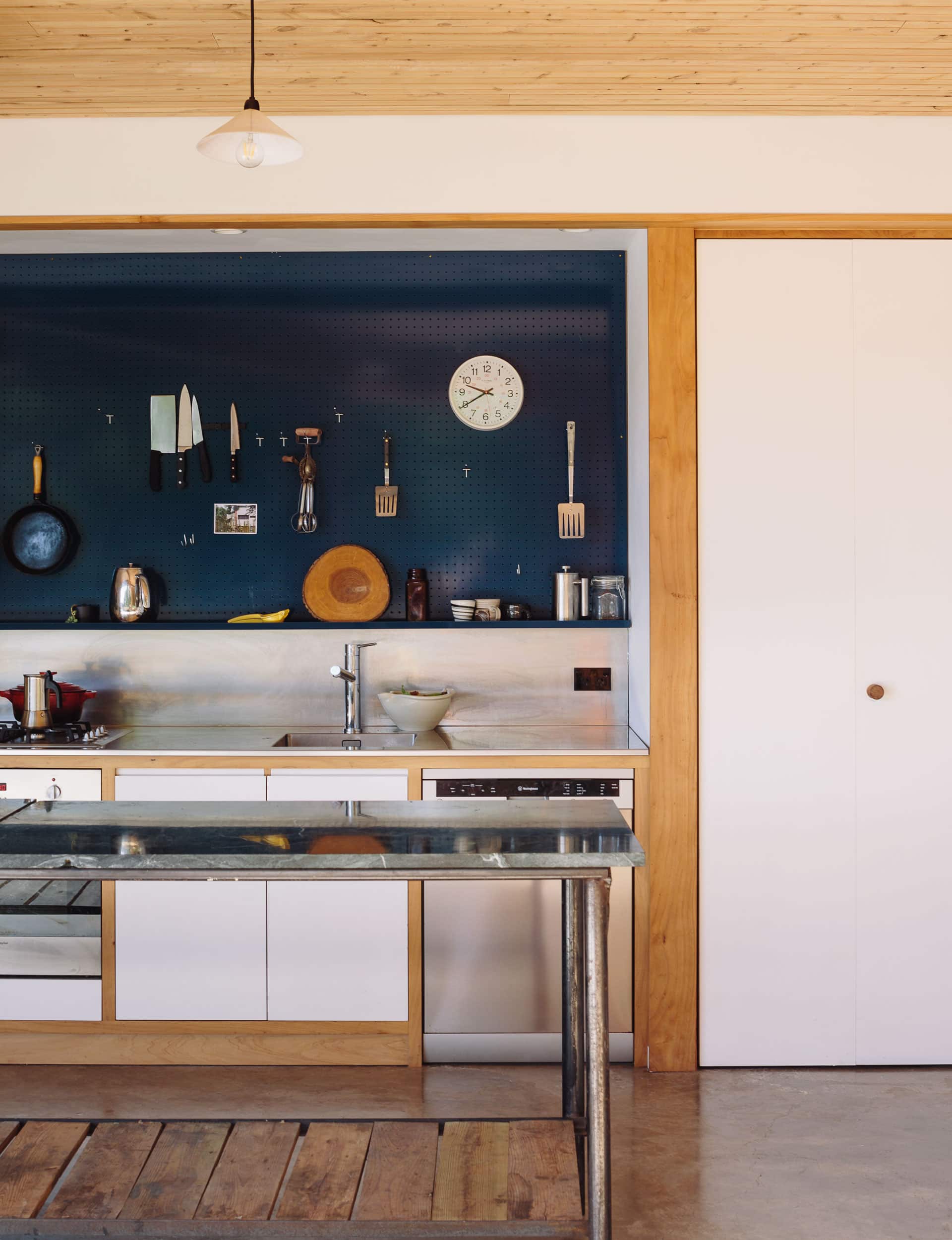 Sally Ogle: A bit. The design was fairly well resourced and materials were nailed down before we started (which it has to be for the consenting process). Ben and I project managed the build, which allowed us some freedom to not fully document things like the kitchen cabinetry in advance. The pond is one of the few things we changed during the build. It was going to be a small garden but we realised we could easily turn it into a pond.