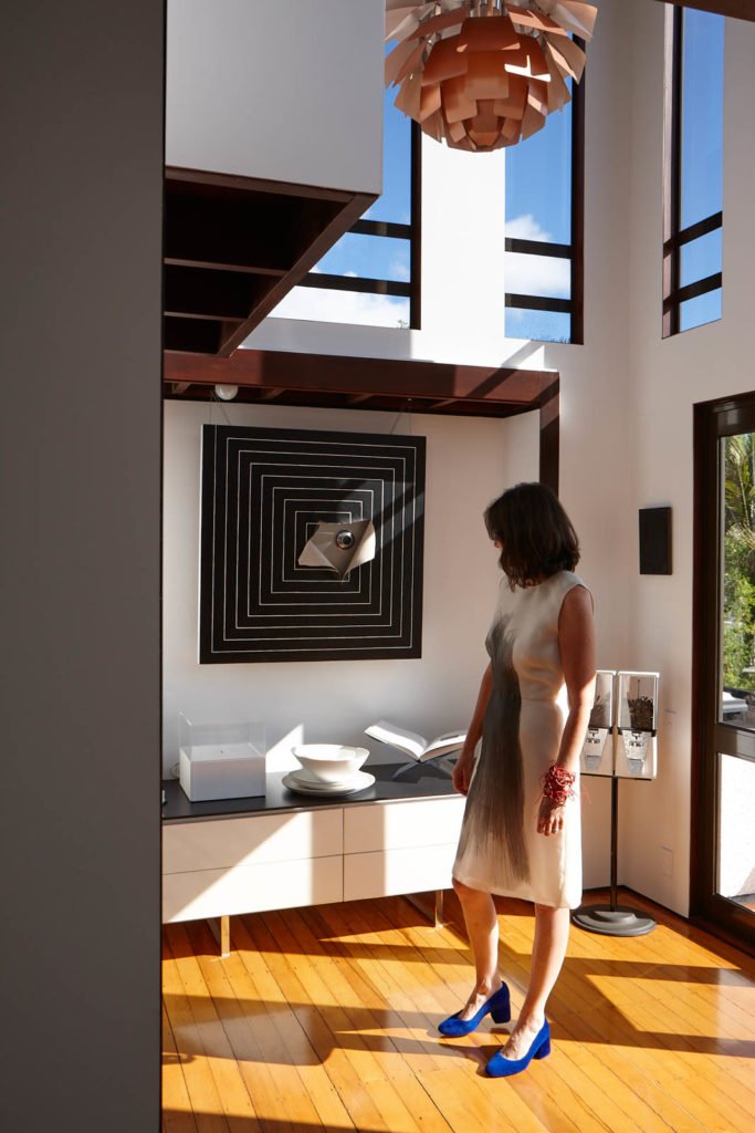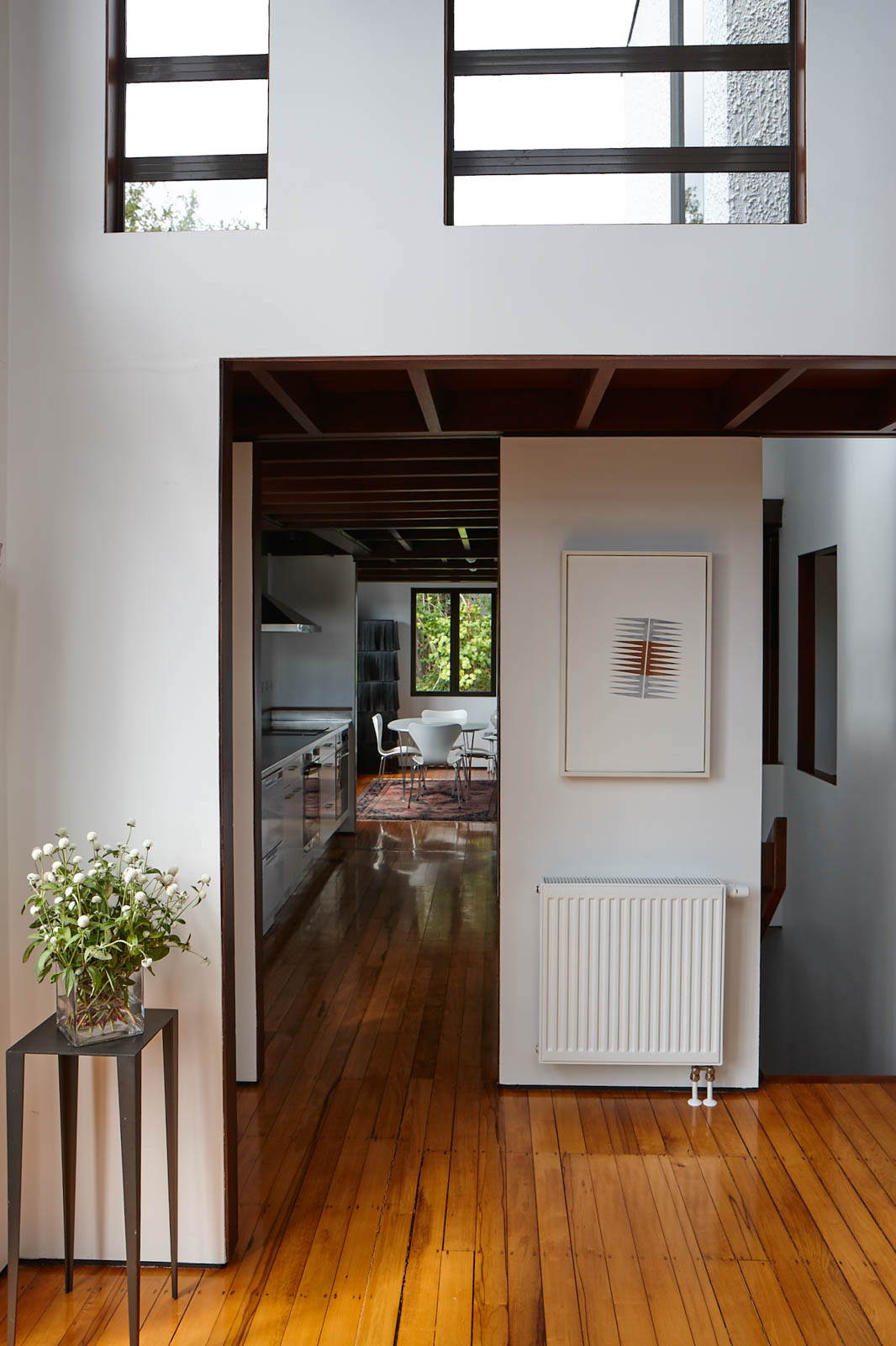 They were thankful that, while a deck alongside the kitchen had been converted into a breakfast room, and a bar had been built into an alcove in the lounge downstairs, almost everything else in the house was original. Charlotte points out that this is now the only part of the house where you can move through three spaces — a kind of central meeting place they call the cocktail lounge, the kitchen, and the breakfast room, on the same level. Incredibly, this later addition is the only room in the house that has conventional windows. All of the other 18 windows are also doors. It makes the house an endless series of interesting journeys with dramatic sightlines from one place to another, fun right up until you have to do the rounds to close it up at night.