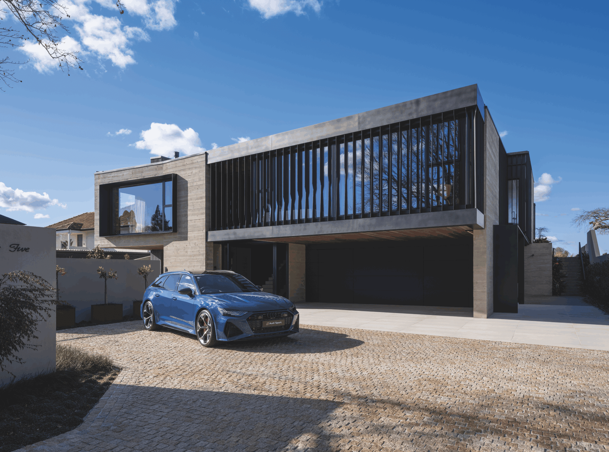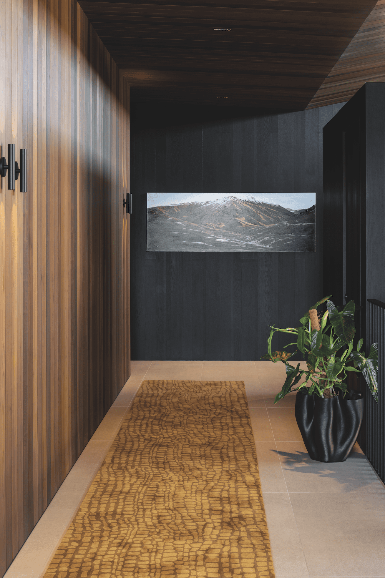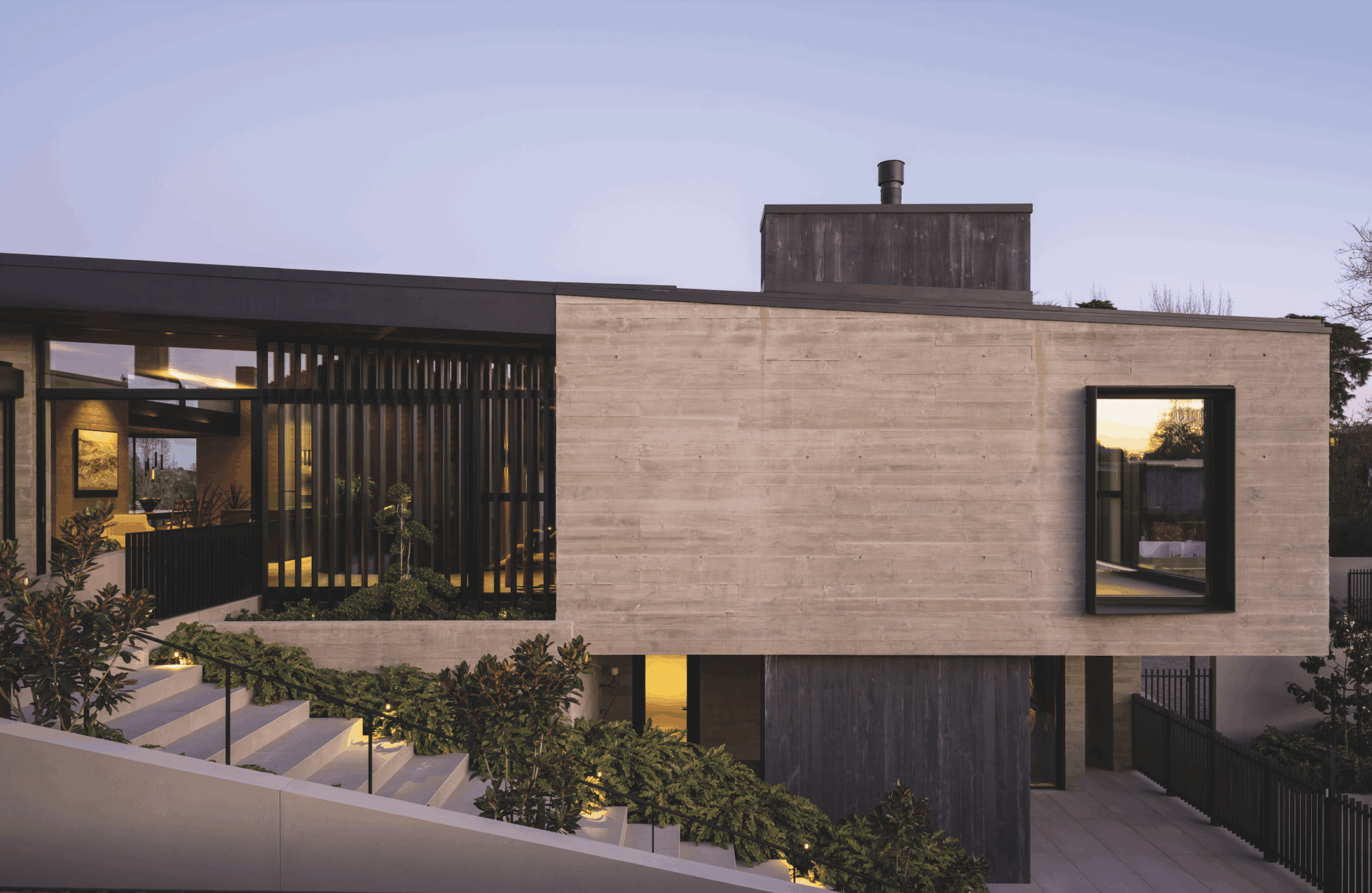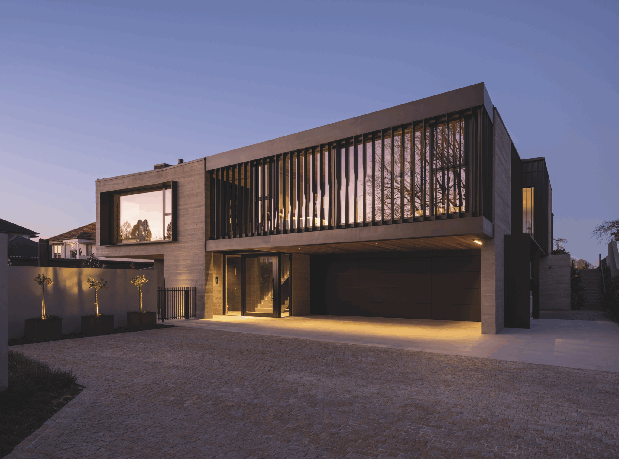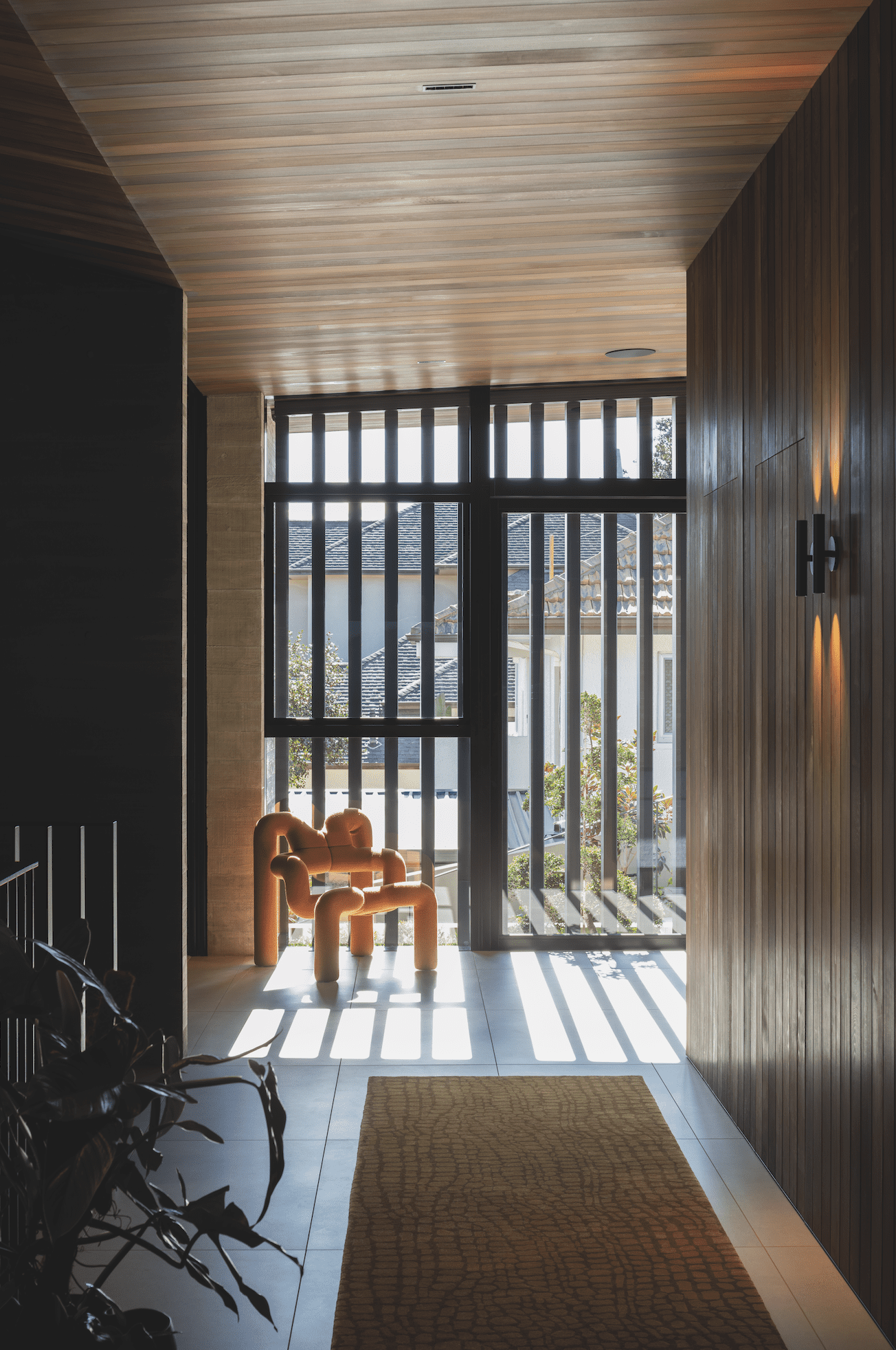 From the street, a rectilinear form of permanence and rhythm asserts itself: warm-toned coloured concrete is juxtaposed with matt-black aluminium and finely detailed vertical screens. This elevation extends across two storeys, the upper cantilevered out to form a central undercroft and, tucked into the westernmost corner, a secluded spa alcove.
