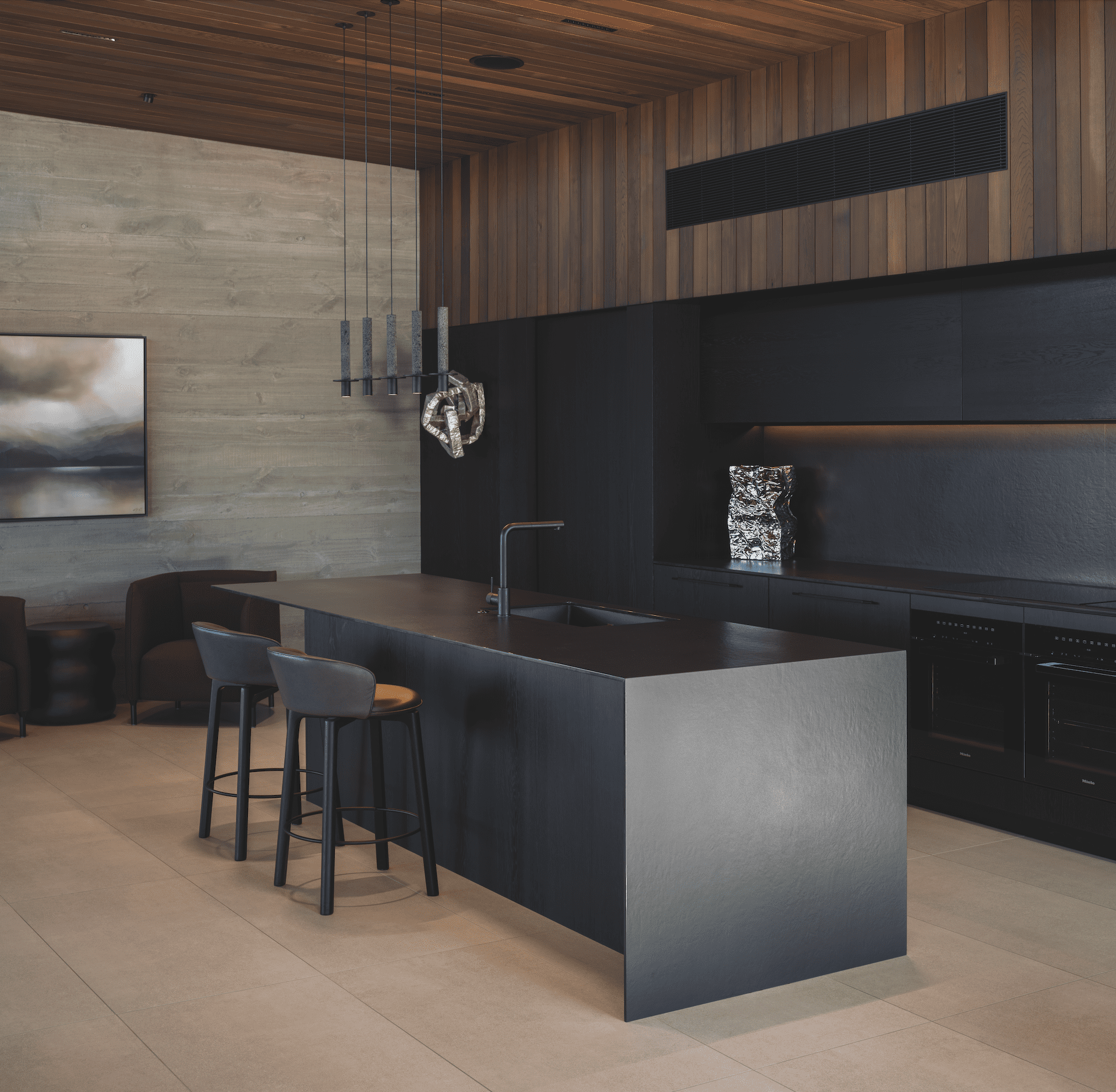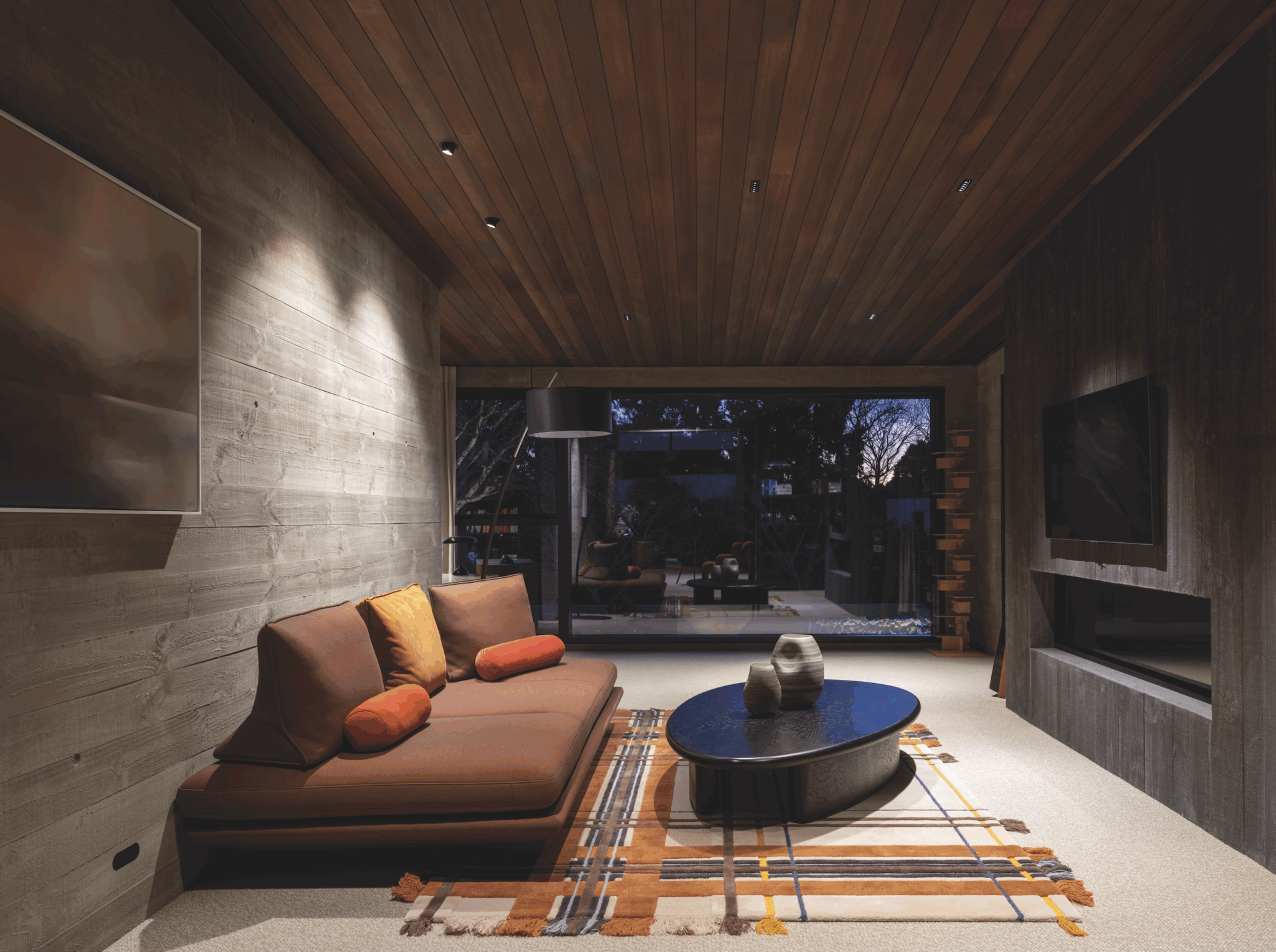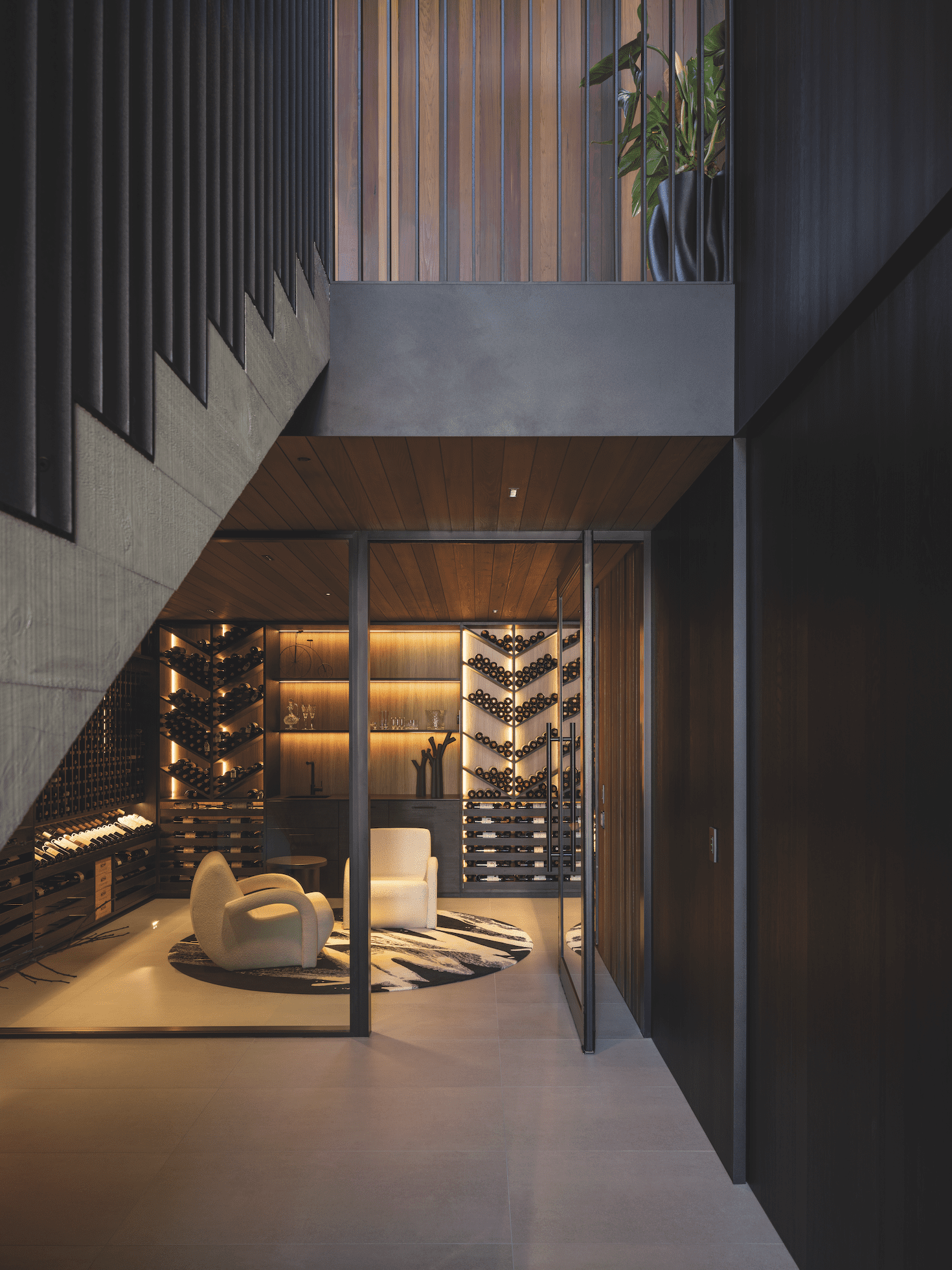 Beyond this bold face, the interior experience unfolds gently. On the lower level, the eye is immediately drawn down the hall to an expansive cedar-lined wine cellar tucked behind the stair. Sealed by steel and glass for temperature perfection, it evokes a sense of bunker-like retreat; inside, two armchairs atop a circular rug mark the perfect spot for enjoying a beverage.
