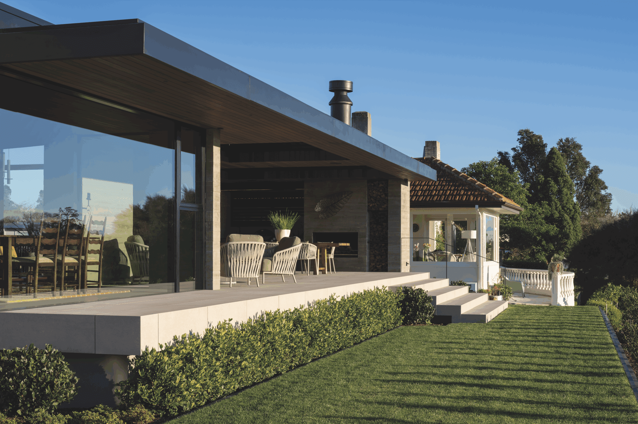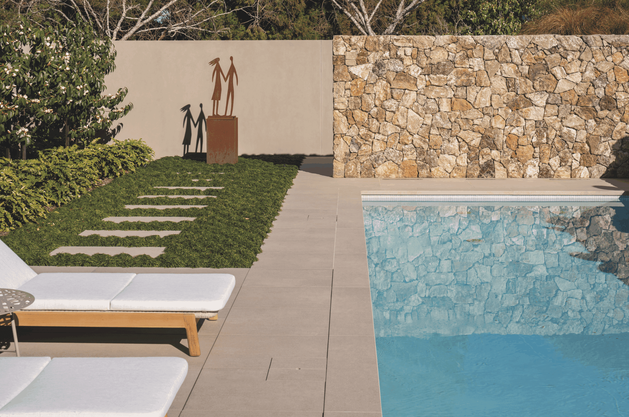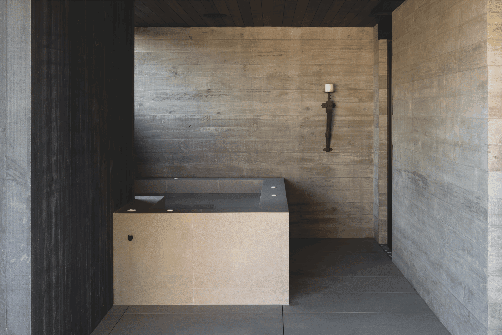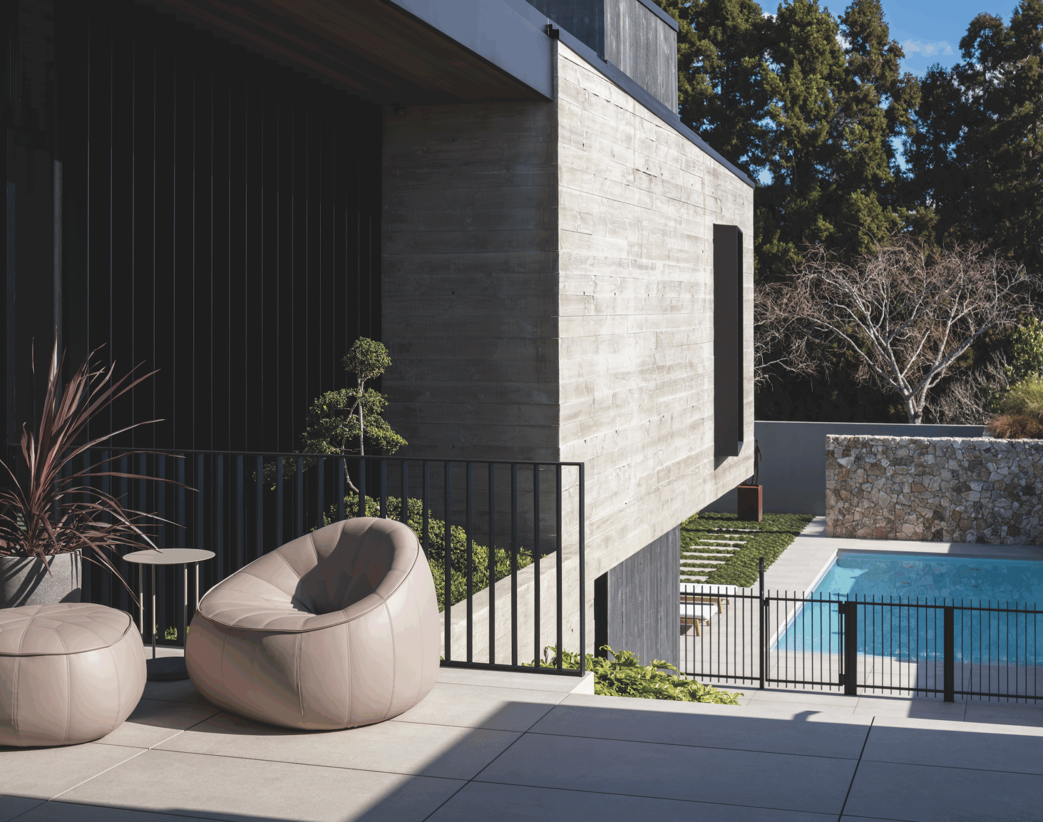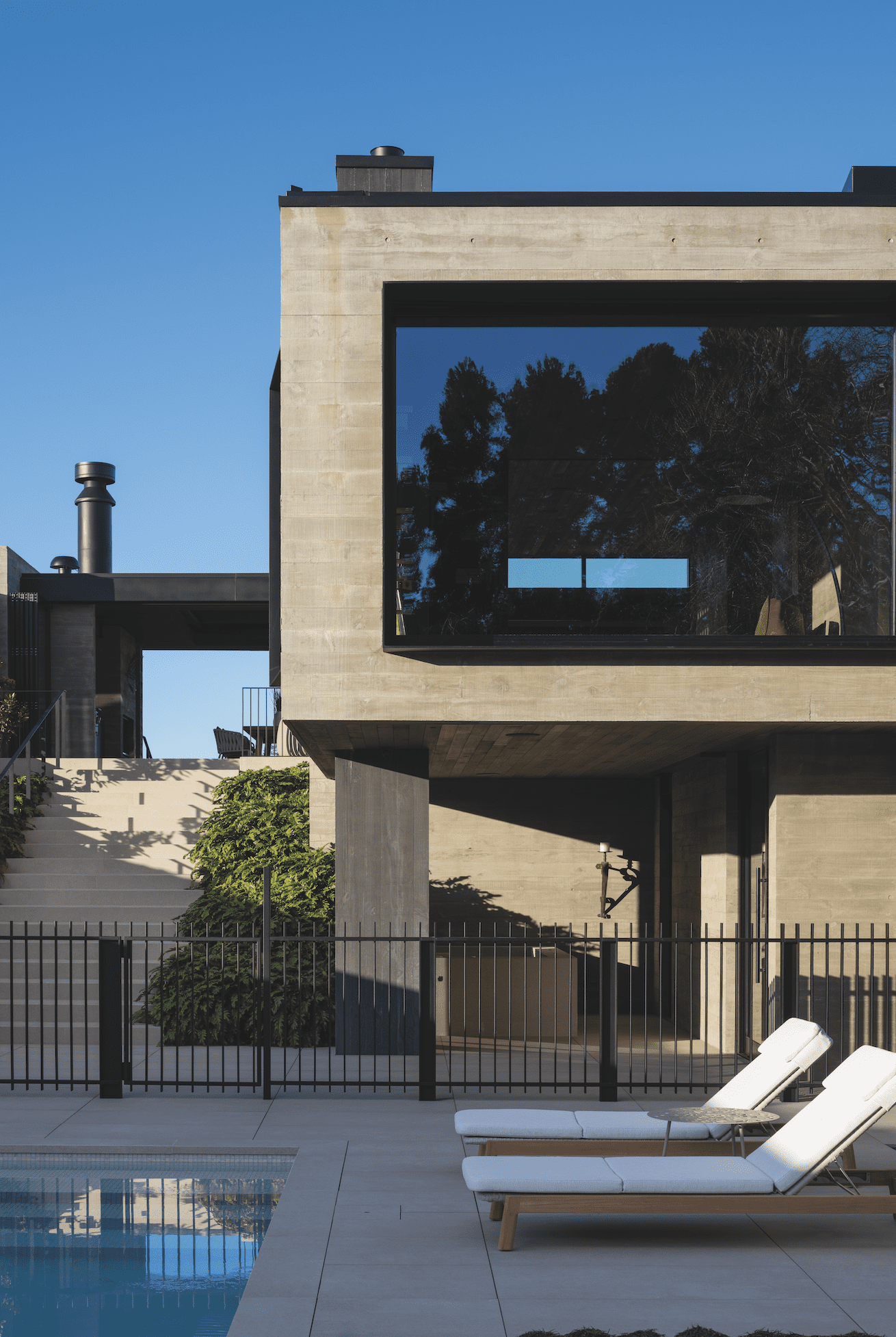 The same tiles used inside flow down the wide stairs to the pool area, which speaks in materiality and tone to southern European courtyards: sun-warmed, textural, and designed for leisurely retreat. The spa alcove, tucked away behind, feels intimate and decadent, shrouded in privacy and framed with the concrete form. Here, the concrete is coloured in a different shade; the vertical chimney rises up in juxtaposition to the horizontal board form that is used elsewhere.