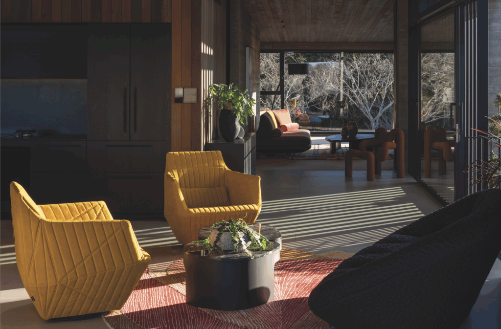 As interior designer and stylist Kelly Gammie of Rarebirds Interiors explains it, “Every angle in this home is incredible. It was a hugely inspiring architectural canvas to work with that needed to be balanced by pieces of equally bold gestures. “Considering the beautiful colours of the trees and the river as seen from the house was the starting point. We selected expressive, bright colours and forms for the interiors that spoke to those hues, while outside preferring more neutral tones and organic shapes and textures.”