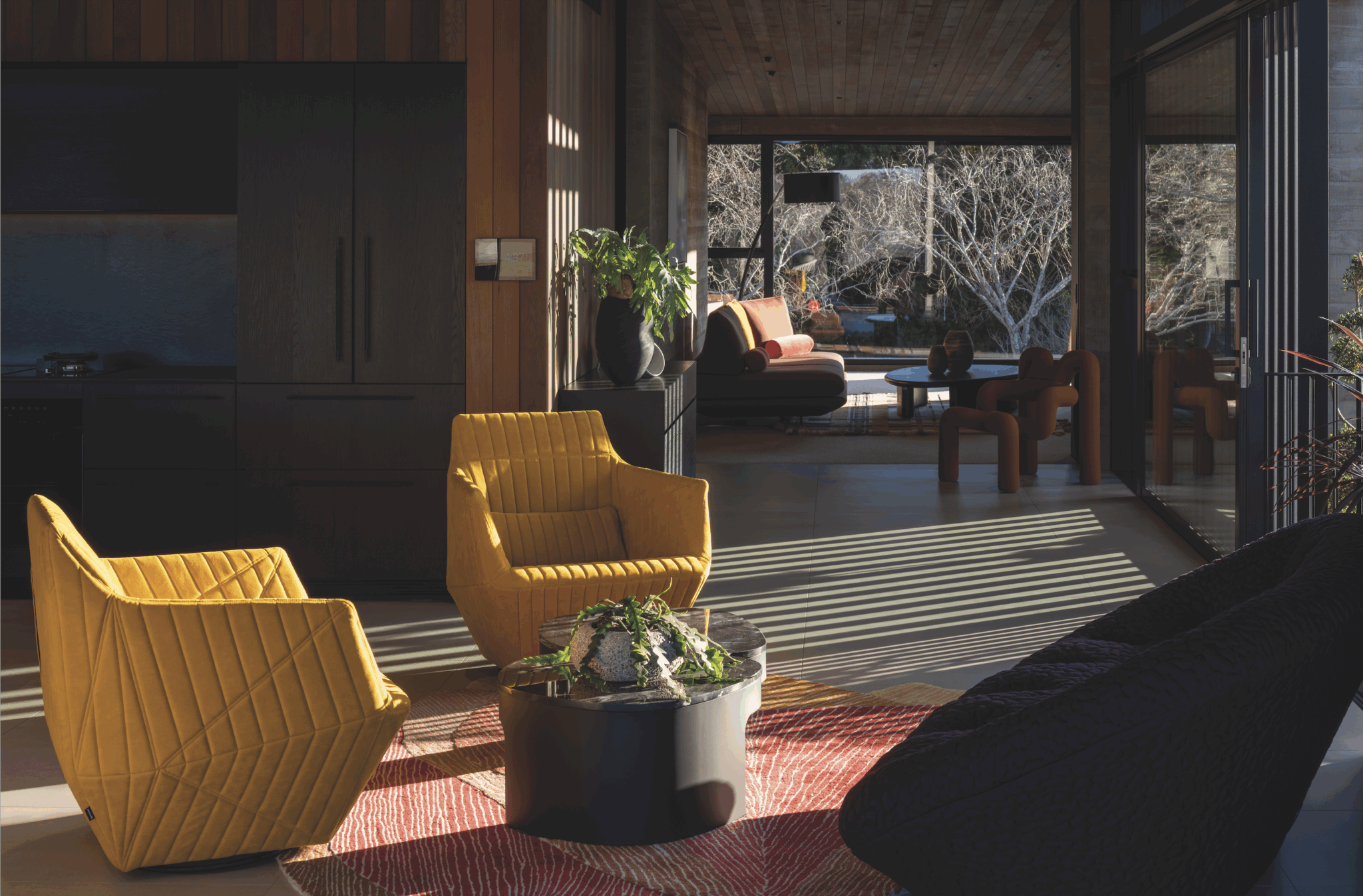 “We wanted to accentuate this verticality by using a darker colour: PeterFell SuperBlack 699,” architect Brian Rastrick explains. Above, the main living area is also defined by the depth of this inky black. Here, afternoon sun warms the room and views extend down across the pool area and the gully beyond. “In this room, the ceiling is at its lowest point so it has a more intimate feel in comparison to the volumes of the entertaining spaces,” Brian says. Throughout, spaces are filled with an array of bold contemporary furniture and art.