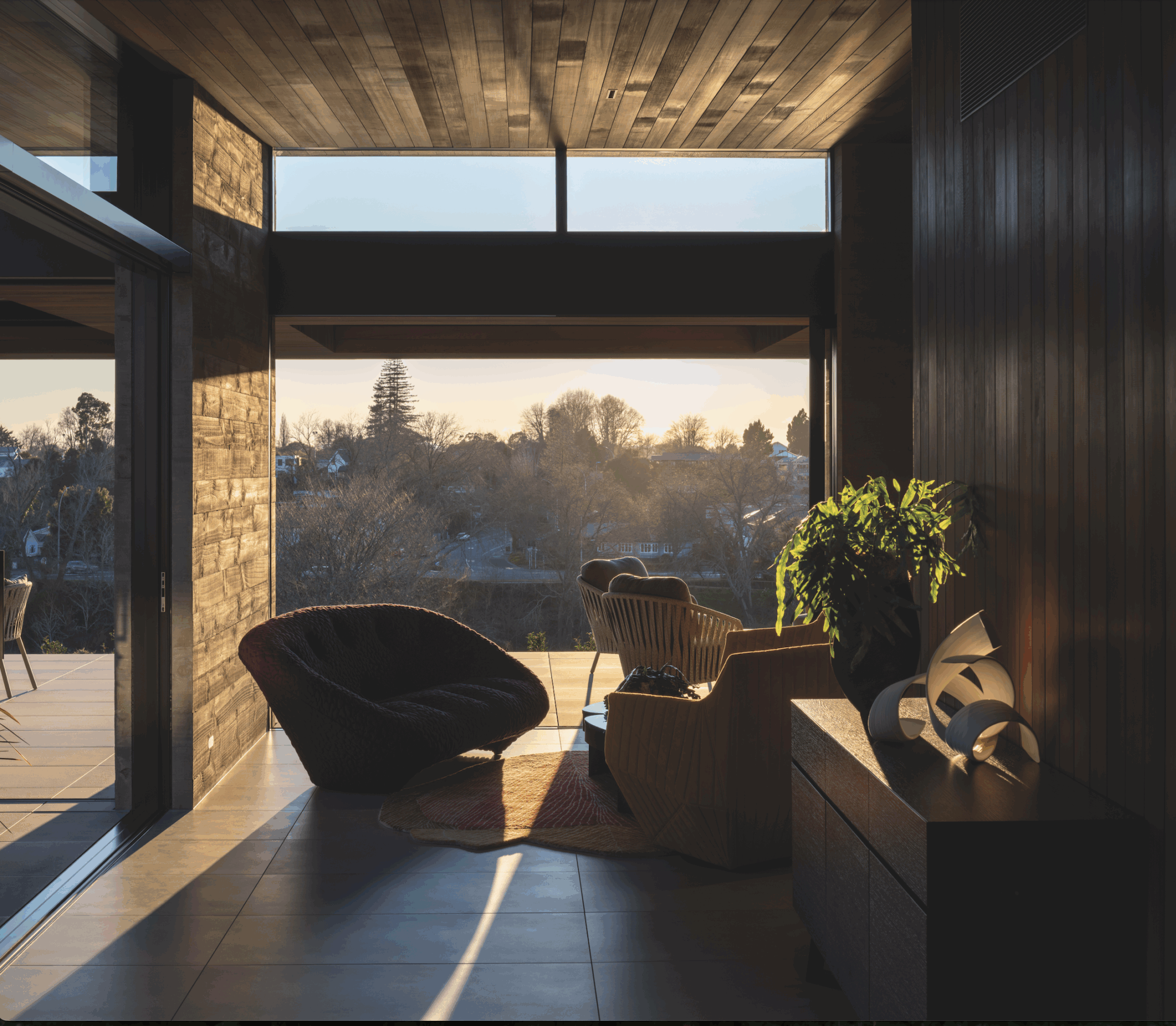 Perched on the banks of the Waikato River, this home by Chow Hill Architects resists a singular orientation. With no real front or back, it’s conceived as a structure to be appreciated from all angles — each elevation carrying its own identity while contributing to a captivating, elemental whole.