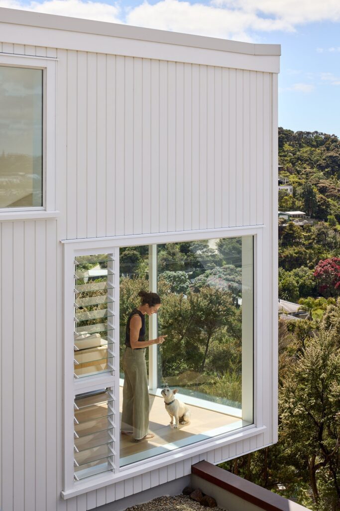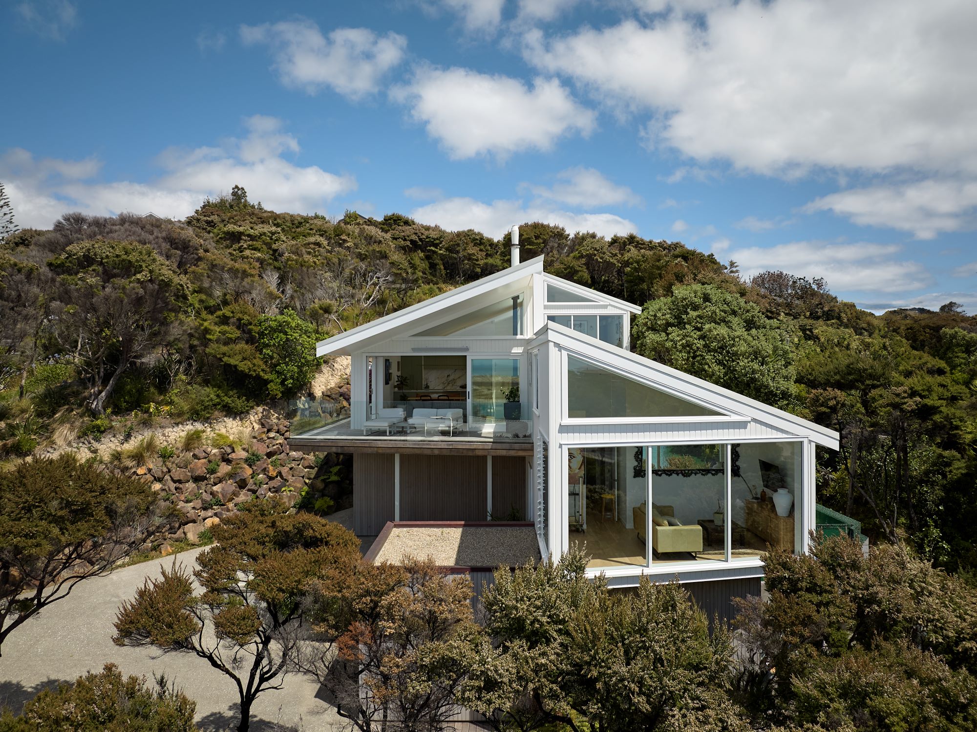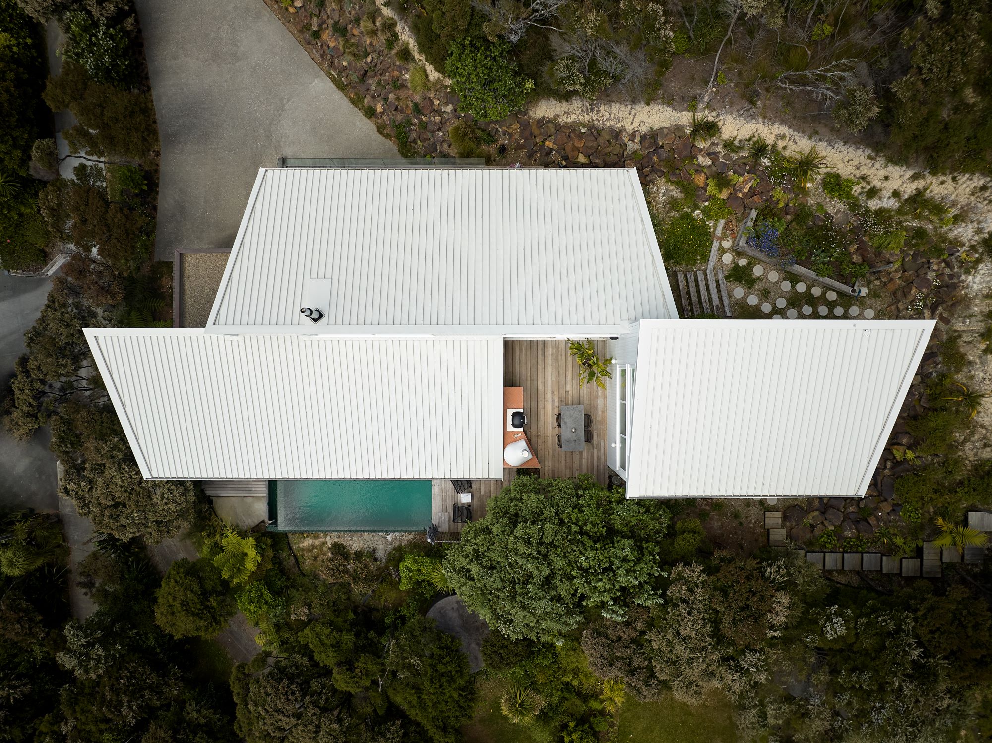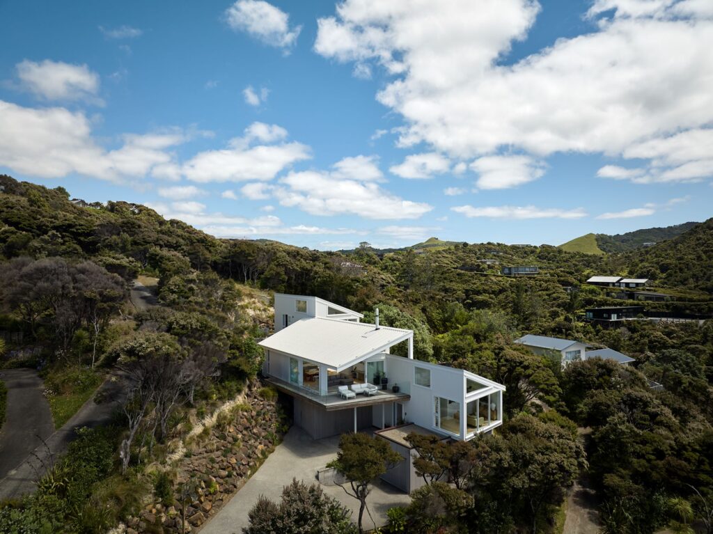 The site nestled into native bush on the hillside enjoys beautiful views of the blue waters of the estuary below, enabling the occupants to watch kayakers paddling while sea-birds float on the air currents overhead. With the boundaries of Auckland creeping closer with every passing year, the convenience of the bright lights are near at hand, if needed.