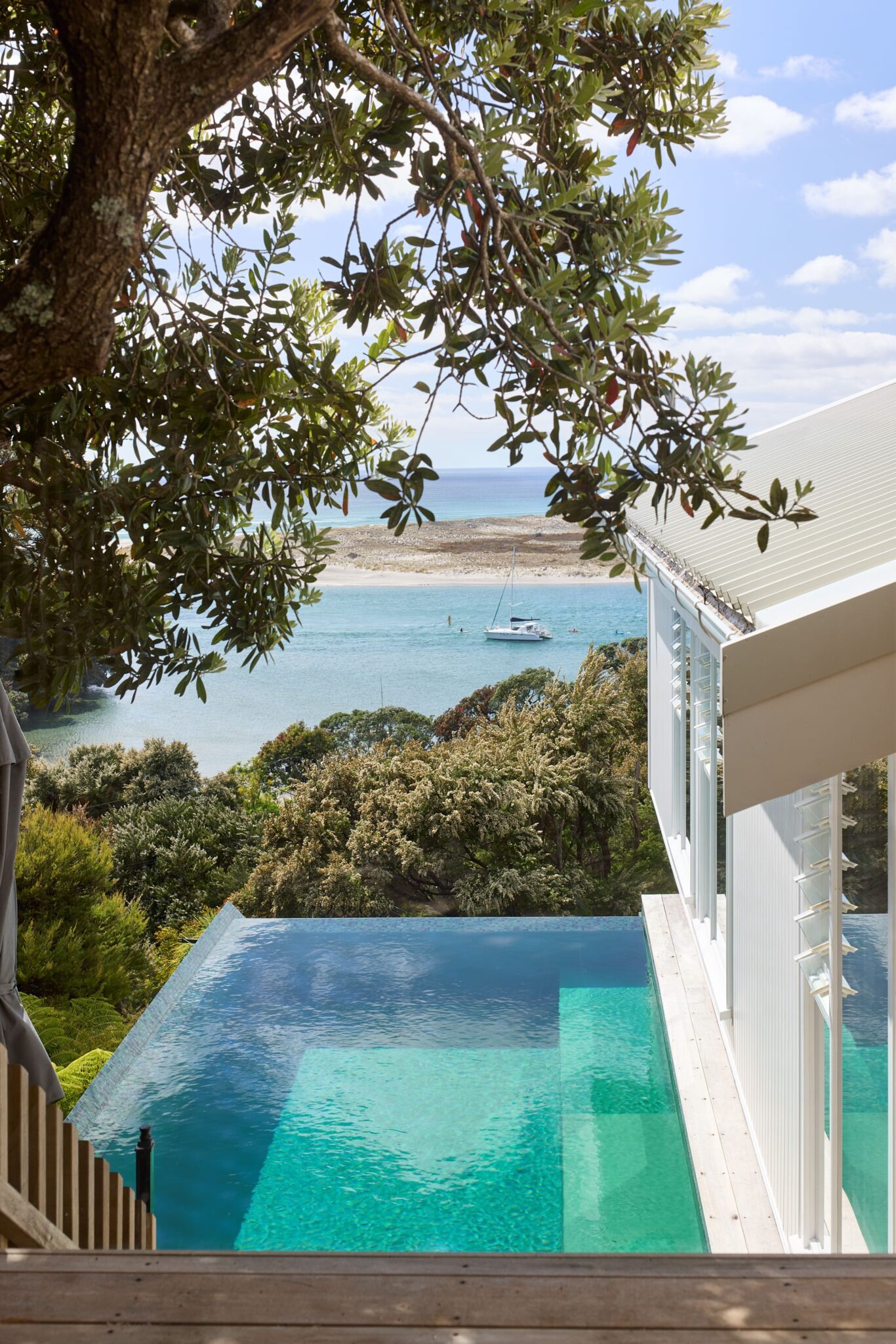 The pool is something of a finishing touch for this treasured spot. Tucked into the side of the house, with an infinity edge that seems to reach straight into the sea, it provides glittering light in the adjacent rooms. With a house, a pool, and an outlook like this, there is no wonder the couple decided to make this Mangawhai location home.