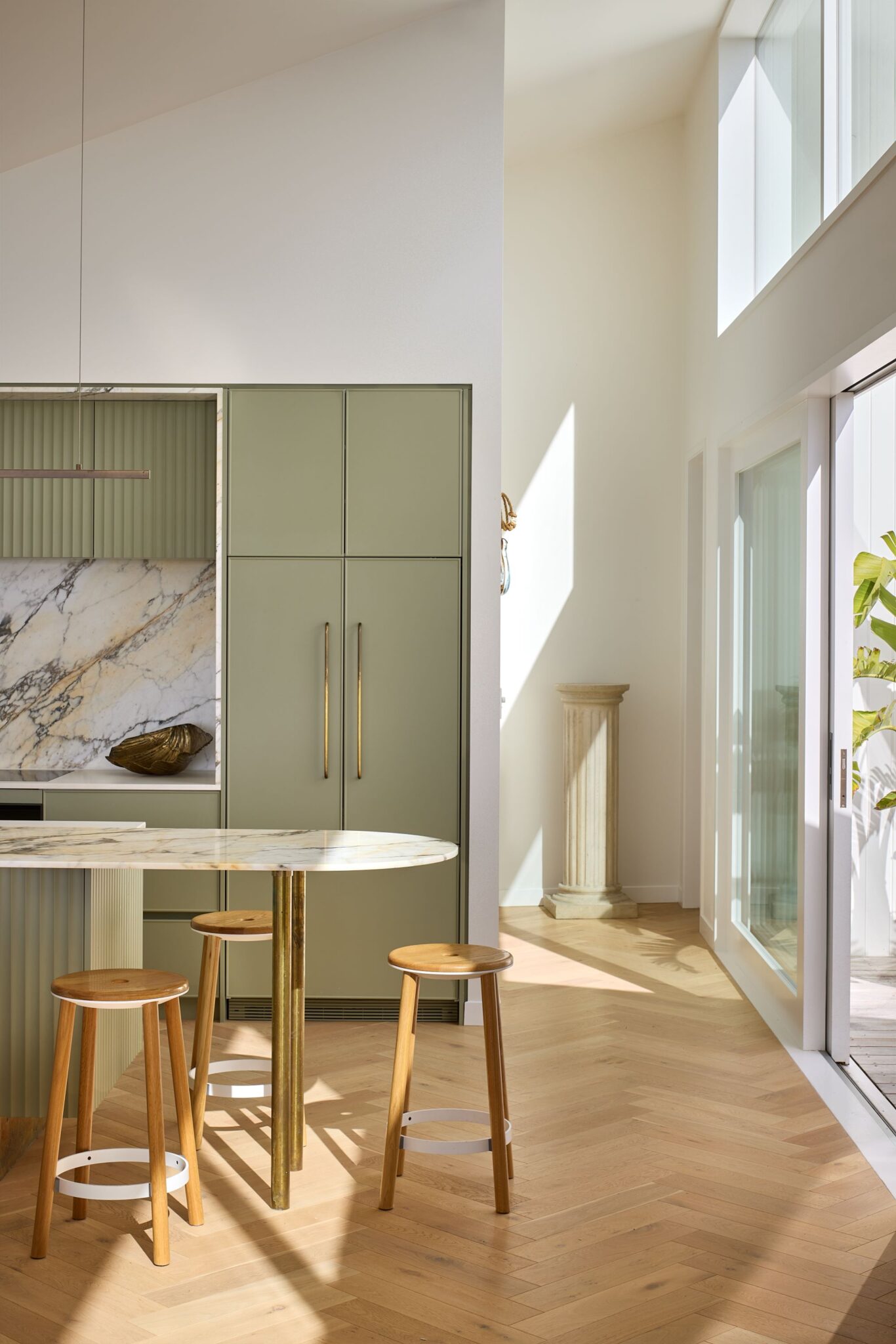 Created by Niche Design in collaboration with homeowner Charlotte, the kitchen features avocado-green cabinetry with linear detailing and a dark-veined, white-marble splashback taking centre stage. A raised tabletop of the same material on the end of the island provides casual seating for the family, while the parquet timber floor lends a sense of timelessness.