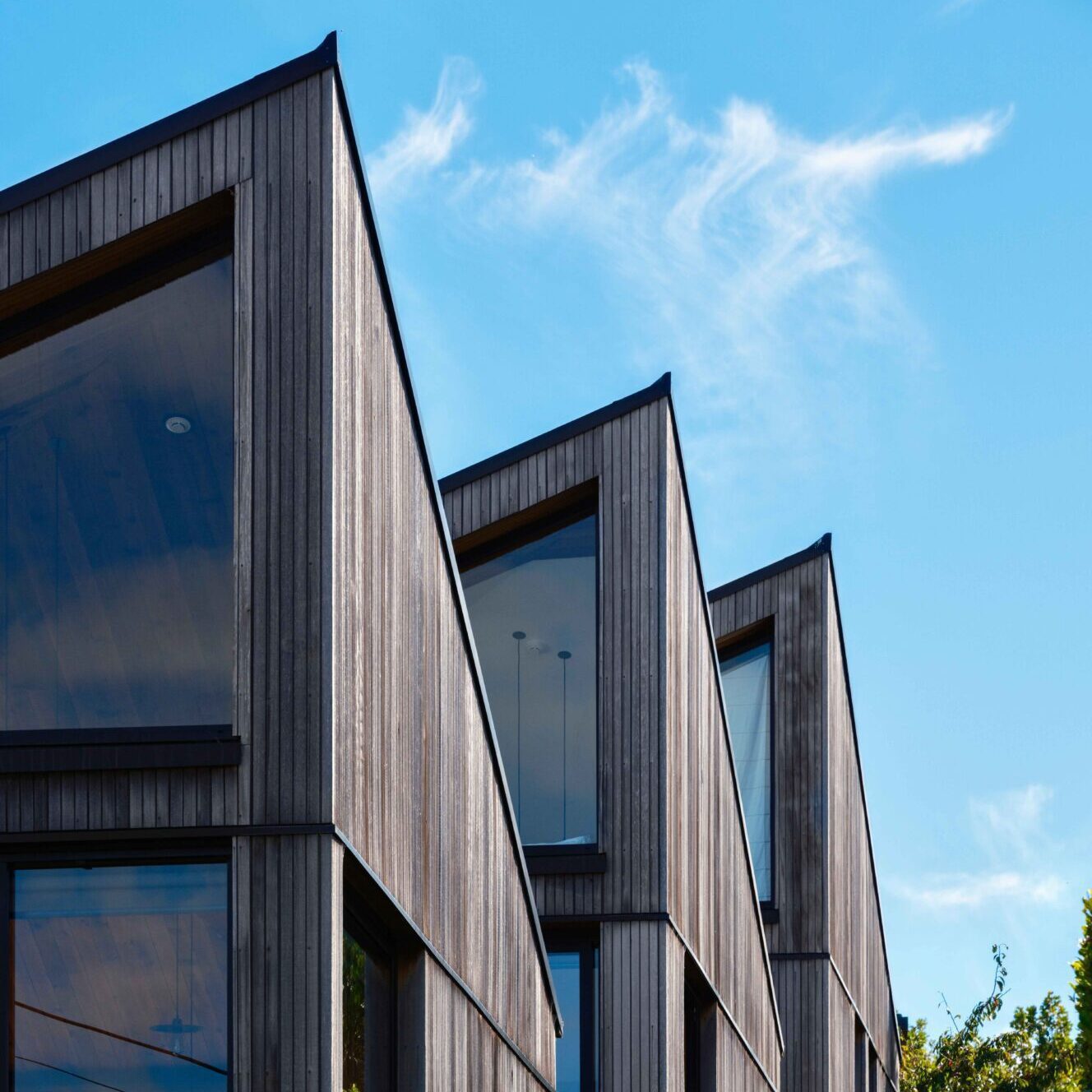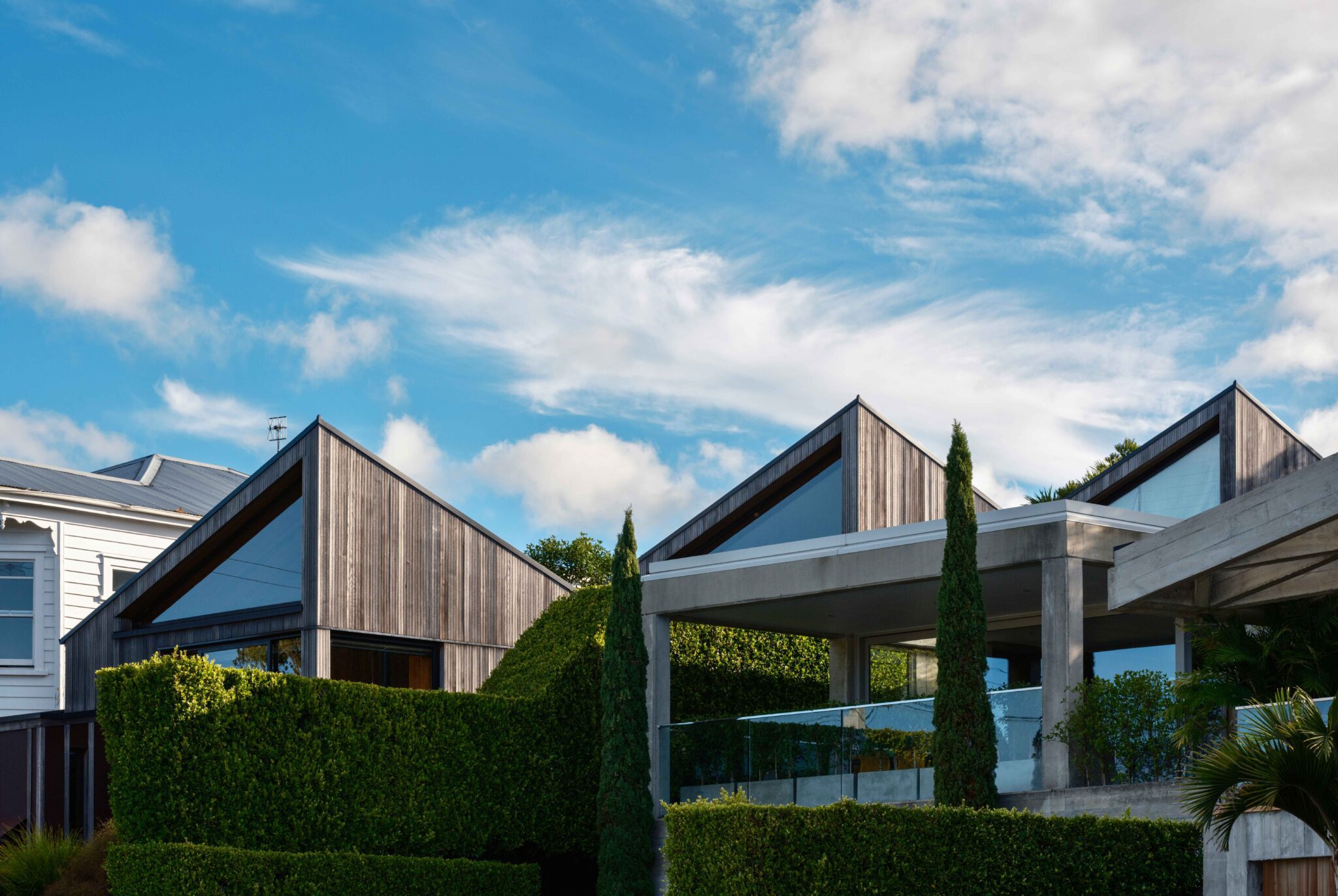 The context of traditional kitset villas was well-considered from the beginning, with each pod’s gable emulating the skyline of the pyramidal rooftops. “The house was always going to feel right from a formal point of view,” explains Rich, “having three repetitive form shapes that were derived from the villa’s DNA. It was about fitting in with your older cousins.”