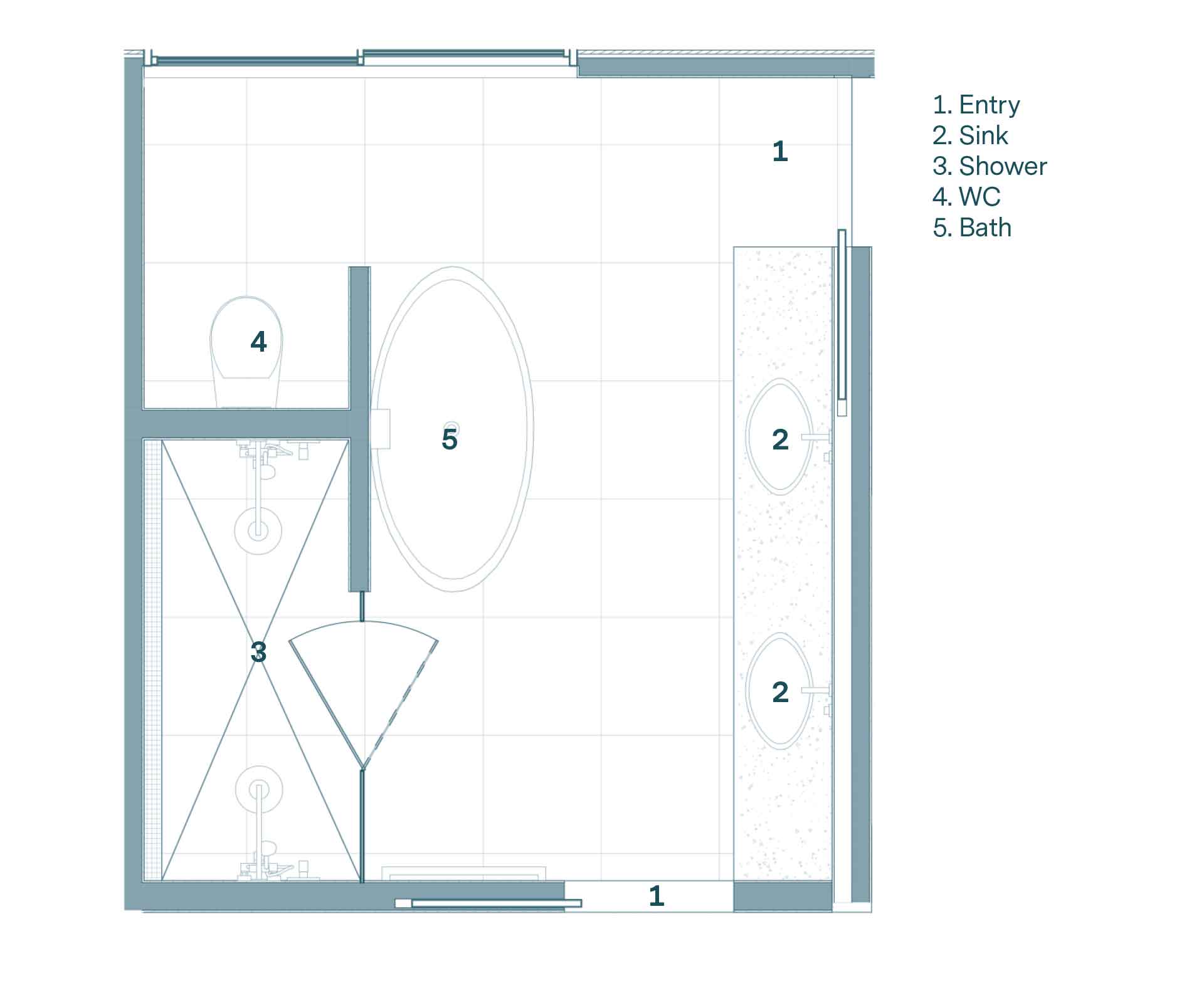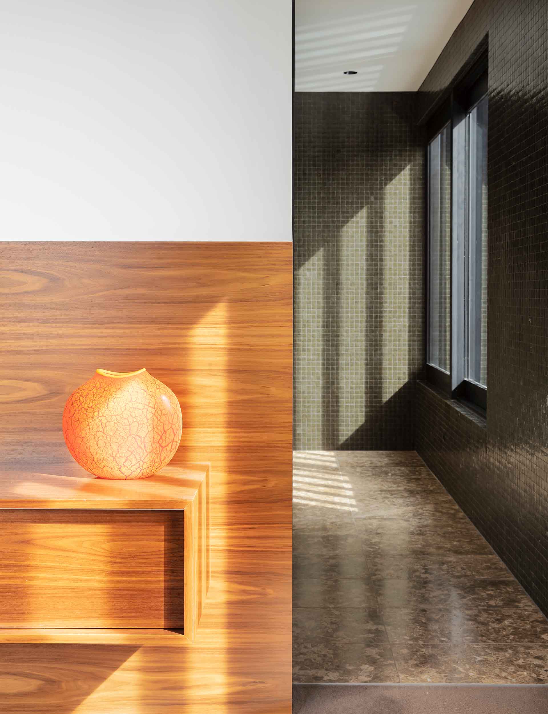 It’s in the way the materials respond to the play of light. Although the room is dark and moody, light filters through exterior louvres and scatters on the mosaics and illuminates the limestone. This gives the room depth and a luxurious nature that belies its scale. Planning helps too – tucking the WC and shower into separate compartments allowed us to showcase the bath,