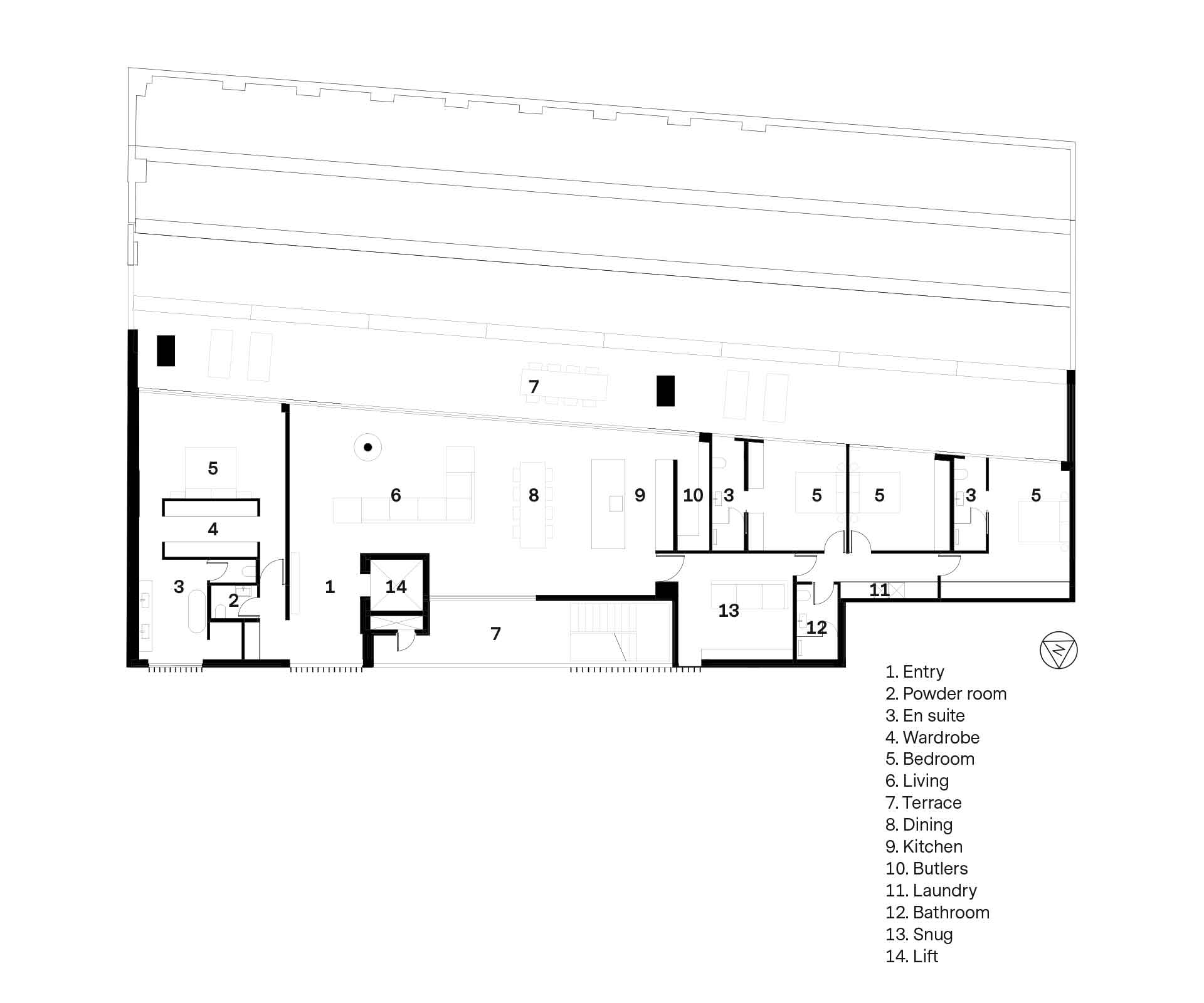 There are pulls and pushes on the outside form of the building that we’ve hidden in the planning. The whole floorplan tapers, but internally you wouldn’t know – it feels quite effortless as it goes from about a 10-metre width to a 5-metre width on the bedroom wing.
