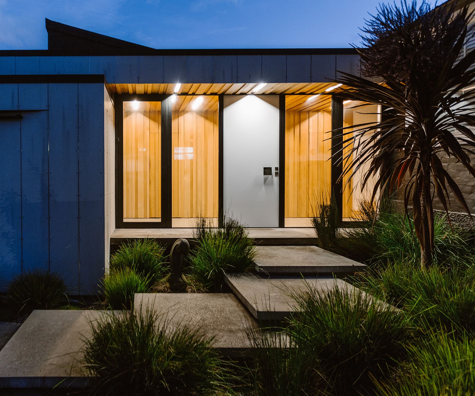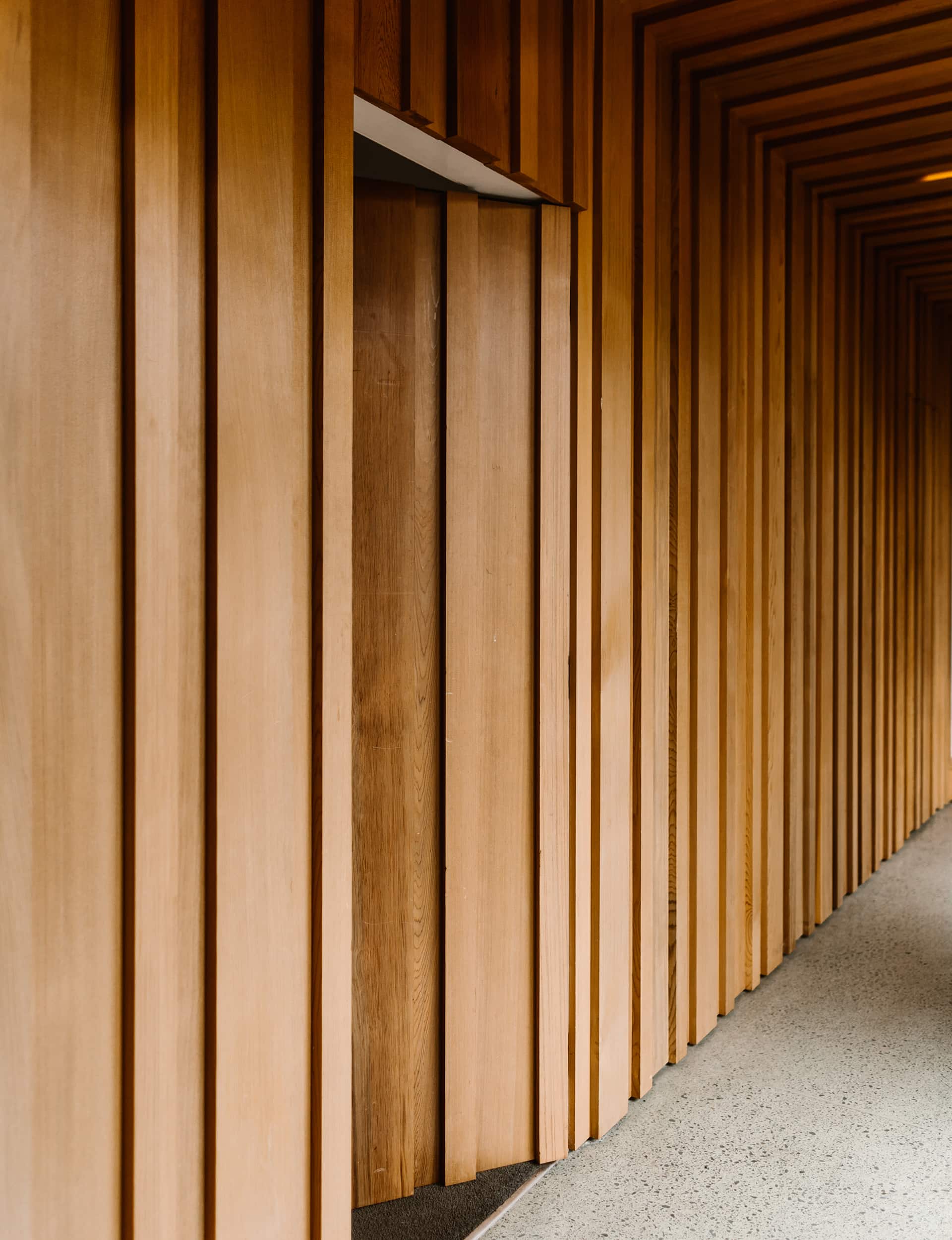 Next to that, a modest extension is clad in raw Eterpan fibre cement and lined with cedar on the inside. It contains two bedrooms and an elegant long gallery entry that extends the original hallway and replaces the old front door. The extension also reworks the entry sequence. The house is now approached via meandering poured-concrete steps, then into the glassy gallery lined in oiled cedar battens, which conceal doors to the two new bedrooms.