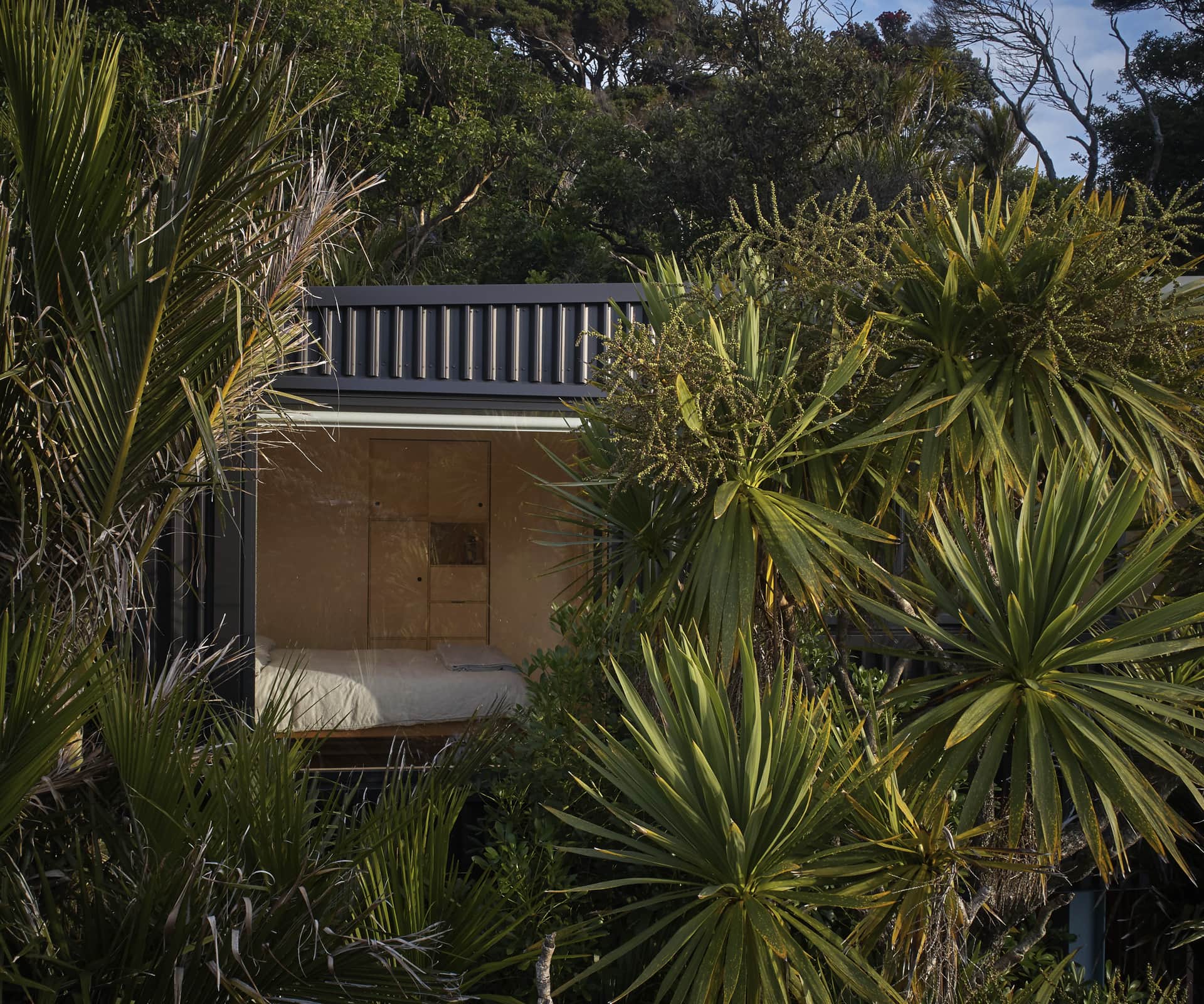 An unobtrusive Piha home makes the most of its small site in the bush by elevating the sleepout into the air