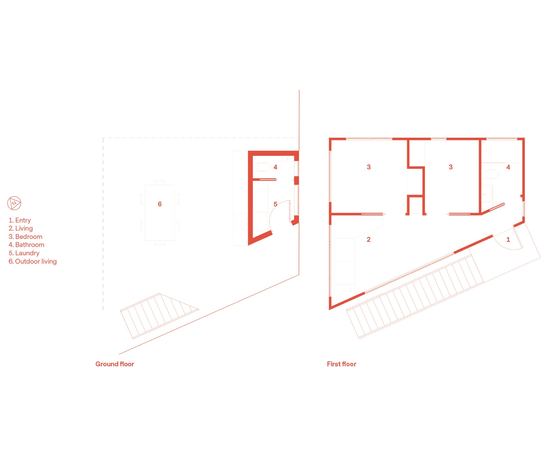 The sleepout is reached by a flight of stairs clad in slatted timber. As you ascend, you rise up and into the bush on one side and past the living room on the other. At the top, the red entry door denotes contrast and intrigue. It opens into the compressed rear of the building – the less-used area. Turning left, the space opens up to the living area and valley view. The angular shape of the sleepout, which helps wedge the dwelling into place, was influenced by the site’s Significant Ecological Area (SEA) zoning.