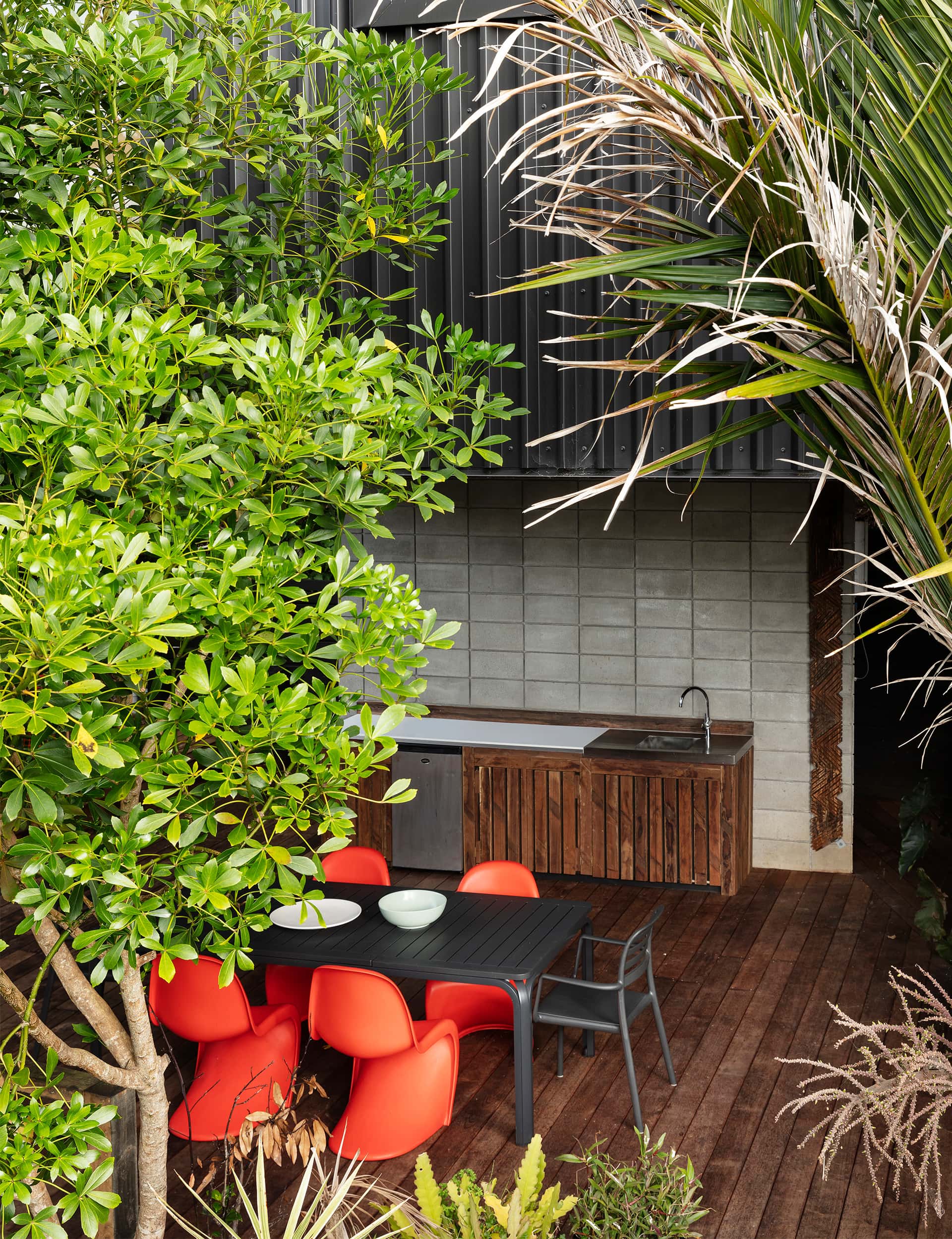The sleepout sits high and recessed into the site, not at all obvious from the street, or even the lawn. Beneath is a spacious, sheltered outdoor platform with a dining area and kitchen. Behind, contained in concrete block, is a laundry and loo. There’s an outdoor shower to one side.