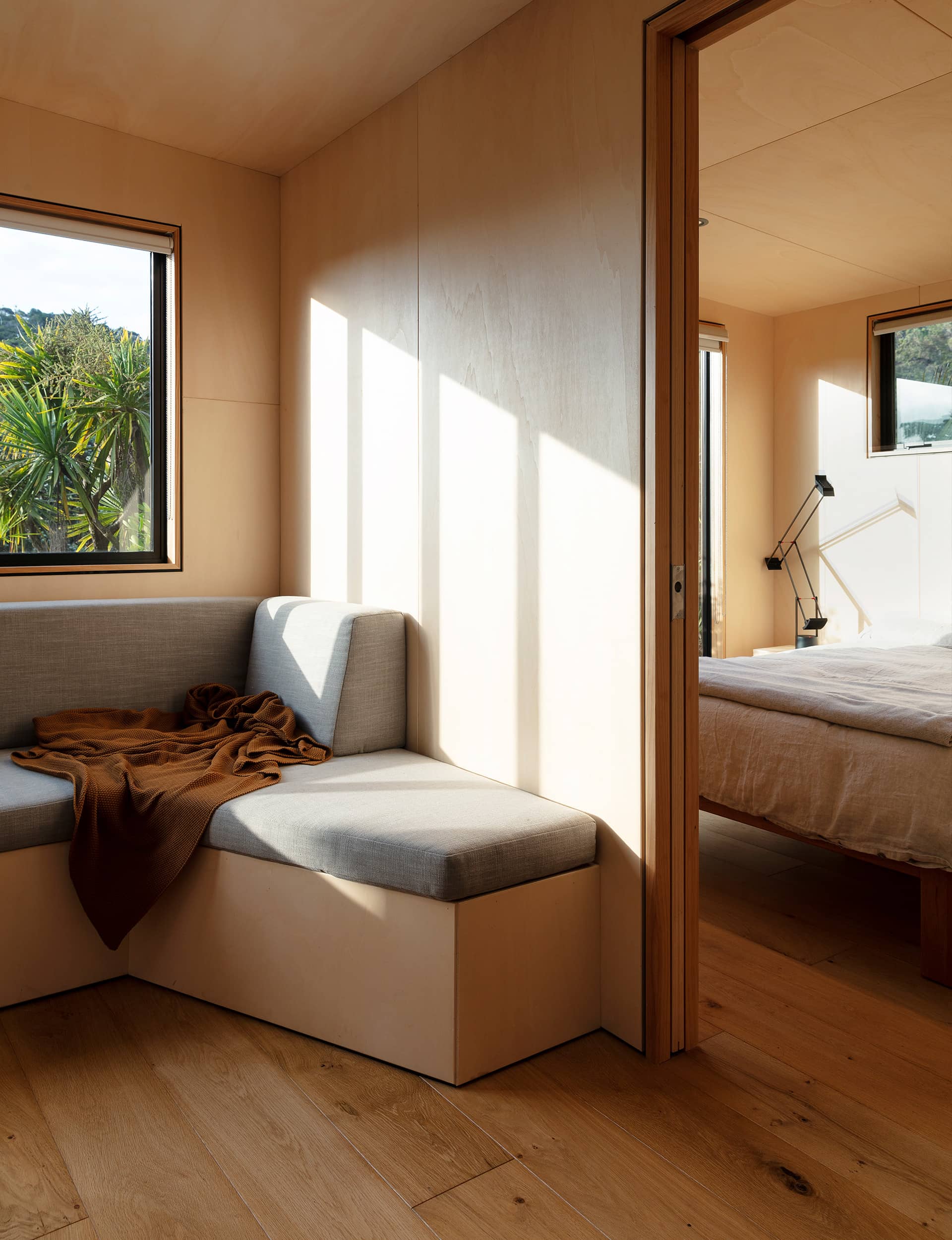 Over the course of the day, sun sweeps over the site, warming different aspects. The sea breeze brings coolness and the sound of the ocean. From the sleepout, giant pōhutukawa just obscure the ocean view – the outlook is a vast sea of green. The beach is only a five-minute walk away.