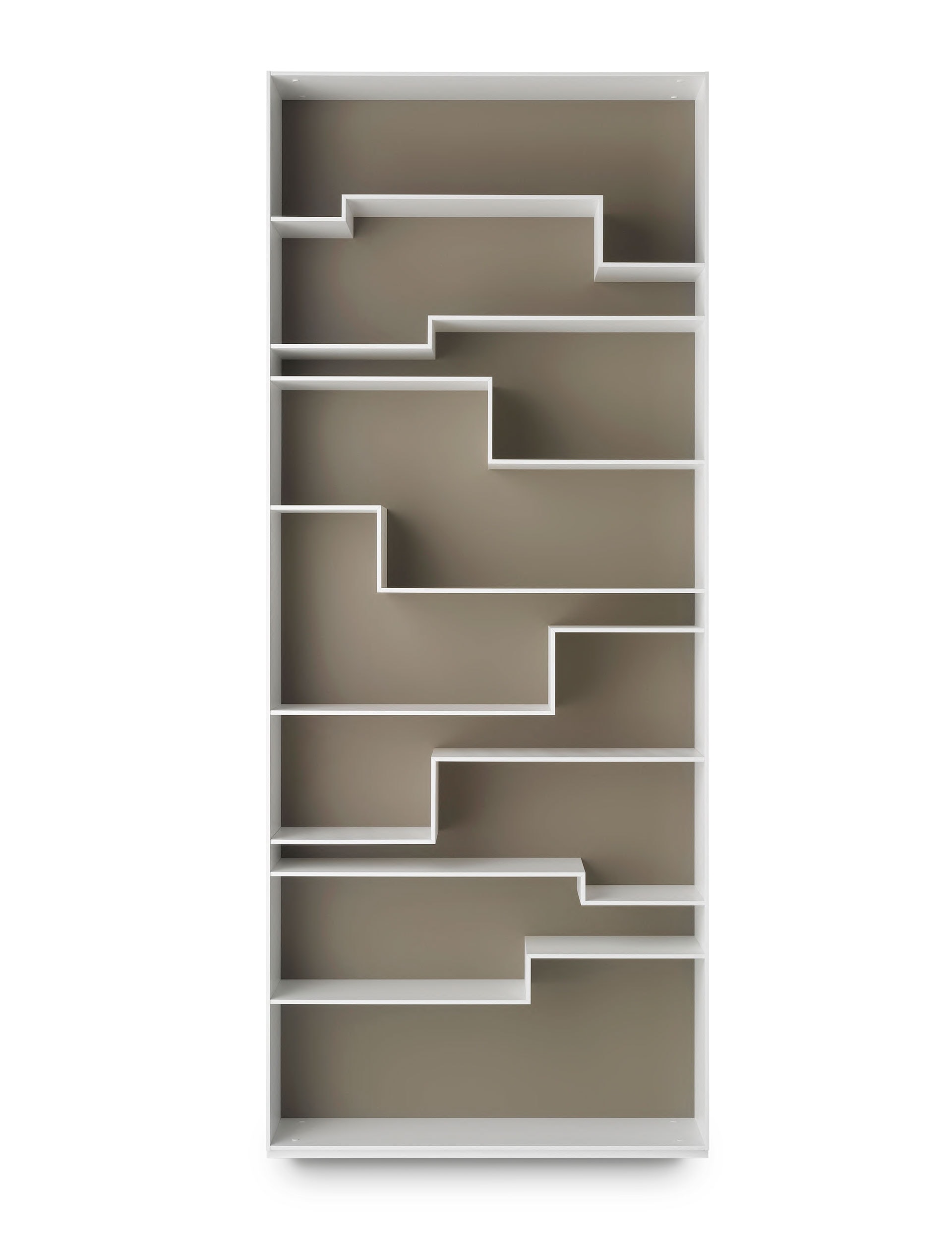 An update of the 2006 white-on-white model – the ‘Melody’ bookcase by Neuland Industriedesign for MDF Italia now has the added option of a colour-contrast backing in dove or medium grey, giving sophistication and depth to the dramatic lines.