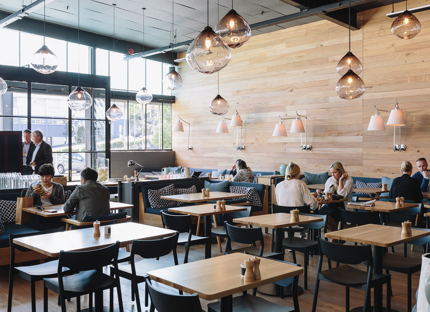 Clare We spoke to Nat Cheshire and his team quite early on and they mentored me along the way – I’ve known him for a long time. We love the industrial feel of CityWorks but we wanted it to be able to feel a bit softer. We wanted the space to feel really calm, homely and understated, with cooling colours and lots of texture in the timber, tiles and cushions. We have Cheshire Architects’ ‘Parison’ pendant lights [winner of the 2014 Design Awards] and chairs by Simon James – working with New Zealand designers was important for us. The ceilings are really high, and the room is big, but I didn’t want it to feel huge, like you walk into the space and see a sea of tables. We wanted it to feel intimate and cosy, like everyone has their own little nook. The acoustics are great, too. I think people feel comfortable here.