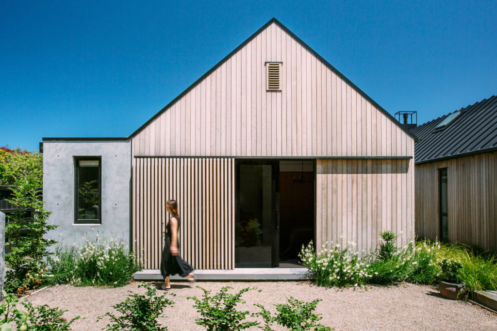 The result is a home of sleek proportions and simple forms — afforded a sharpness by intricately considered detailing. Recessed windows create depth, while vertical cedar cladding expresses a clean linear palette beneath the gabled form. Concrete walls extend out from the gable, intentionally juxtaposing the timber and retaining the sharp symmetry.