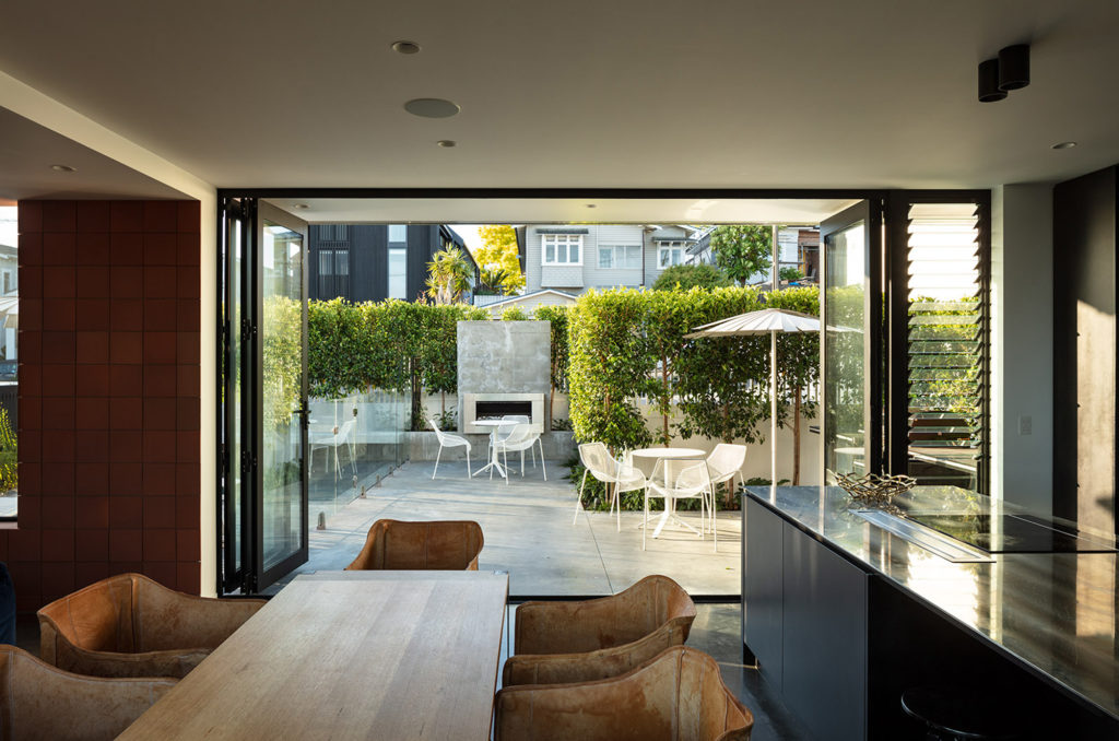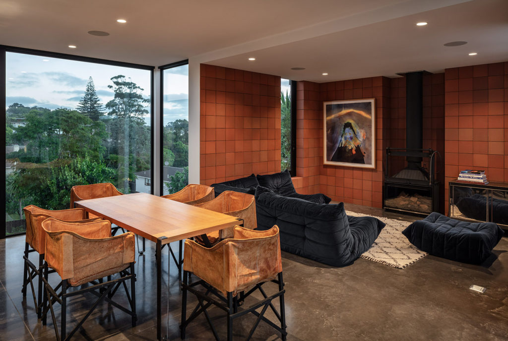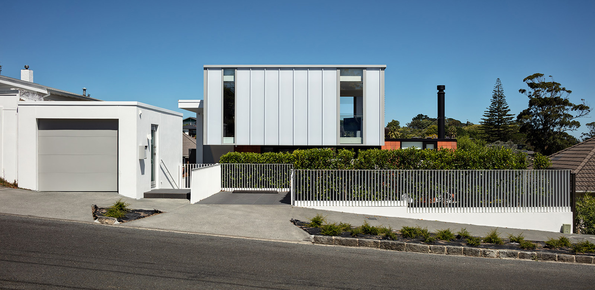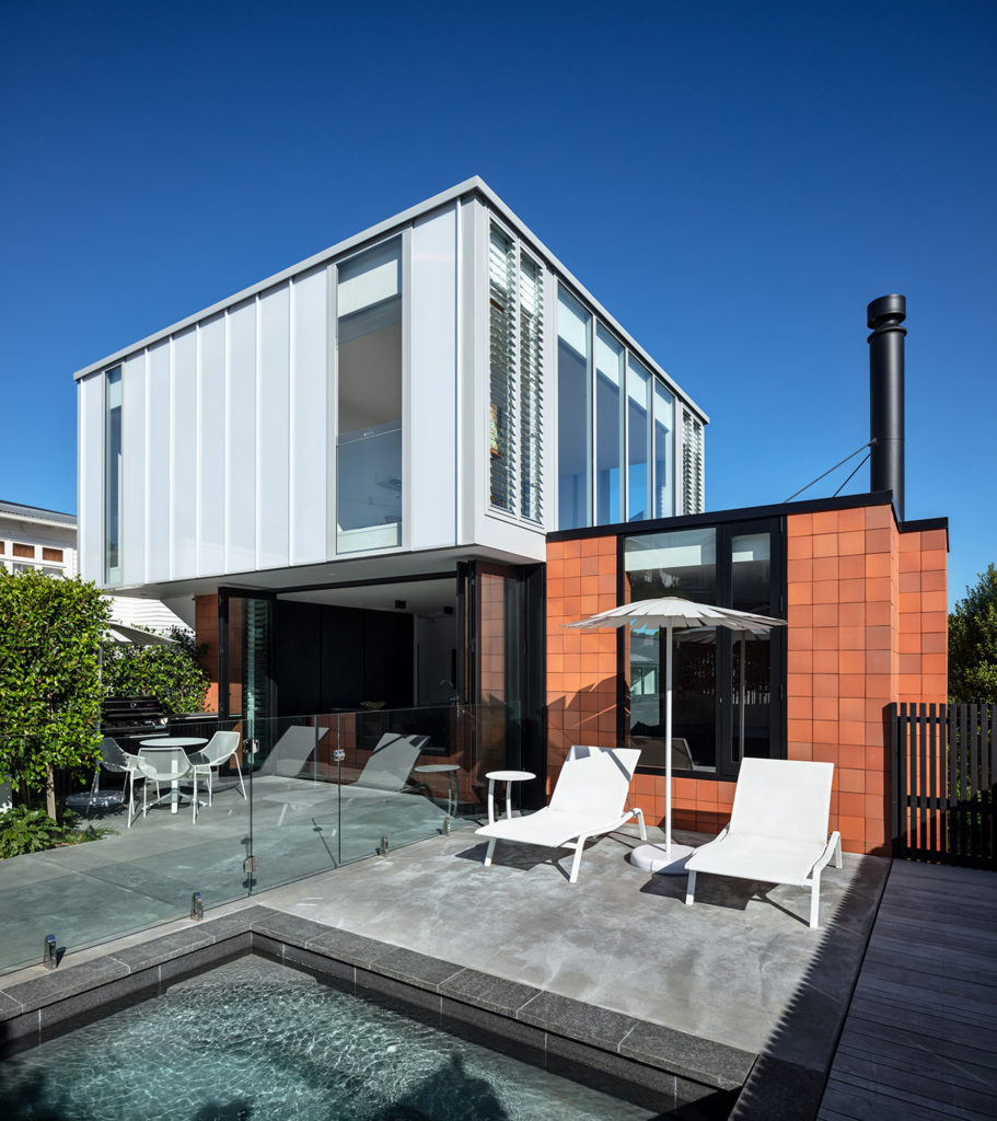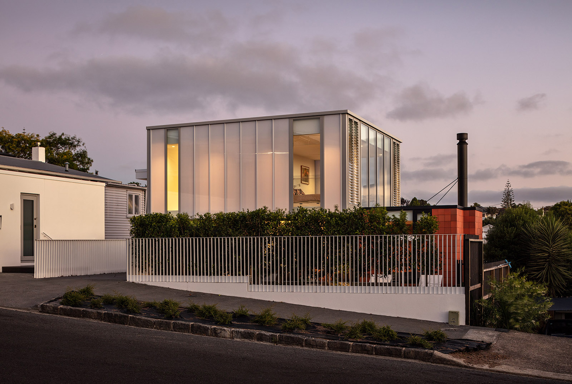 This Auckland home is made up of a trio of individual but allied cubic forms using terracotta, corrugate, and a polycarbonate that positively glows in the dark like an urban lantern.
