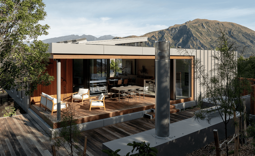 In an established neighbourhood in Wānaka this new home presents a contemporary face to the street. Turning its back on the Central Otago vernacular of gables and schist, architect Barry Condon opted instead for a subtle composition of linearity and curves cloaked in a palette of earthen hues.