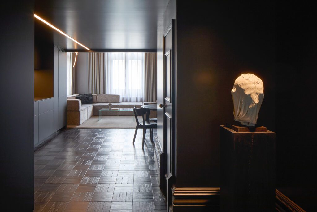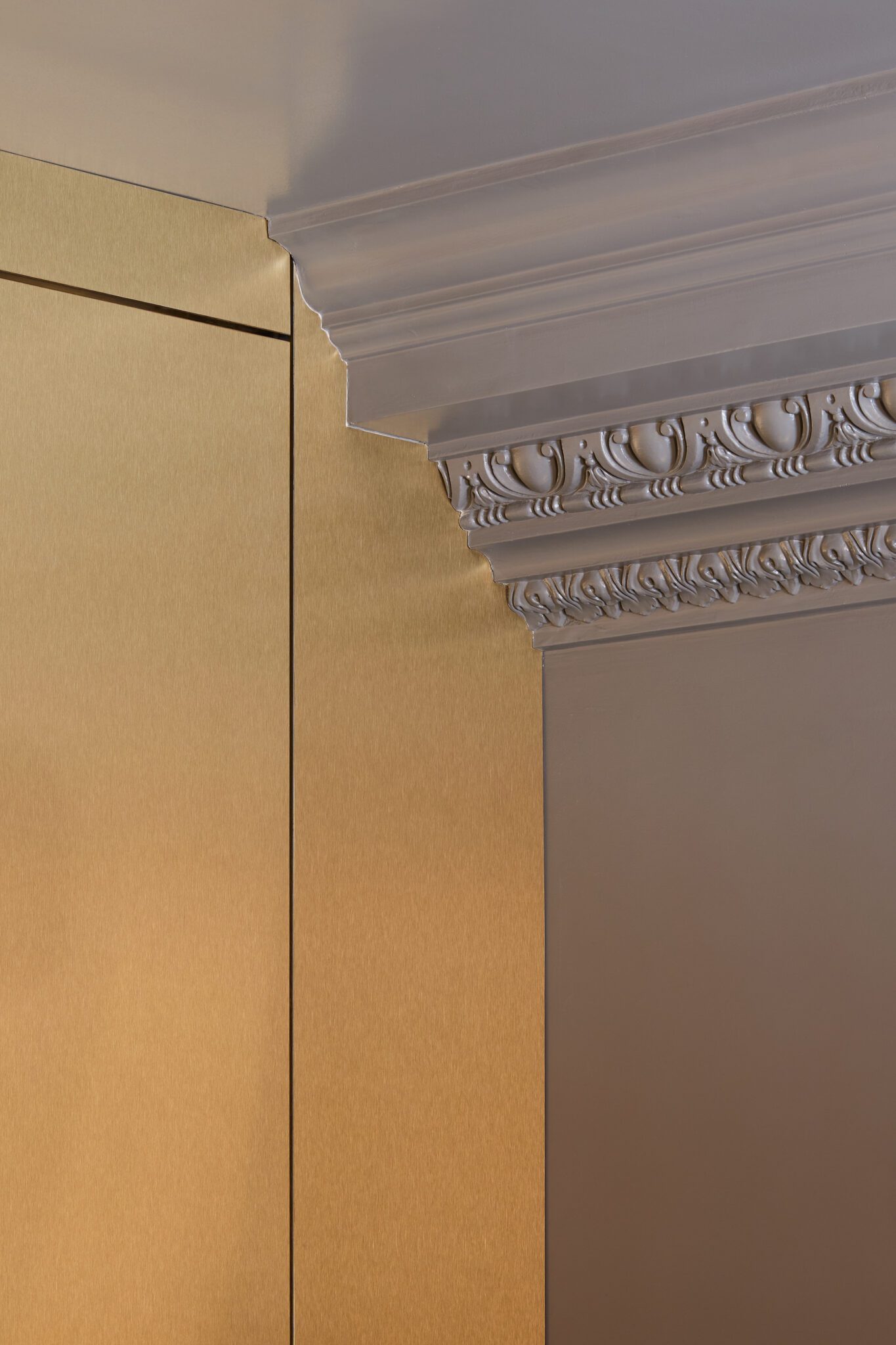 It’s one of the few departures from the project’s restrained grey-and-brass minimalism, and one that gives this space a dramatic and memorable talking point.
