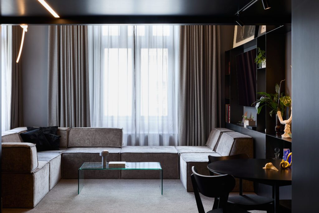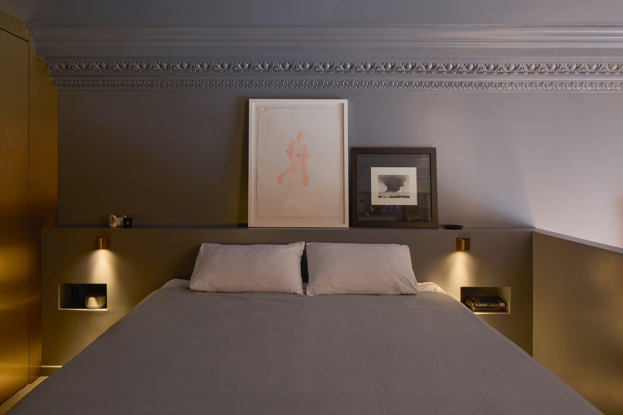Naith describes the apartment as a lived-in bolt-hole: cosy, opulent, low-maintenance. The Kovacs modular sofa dominates the living space, easily rearranged between social and daybed modes. It is, like the colour palette, an exercise in controlled flexibility.