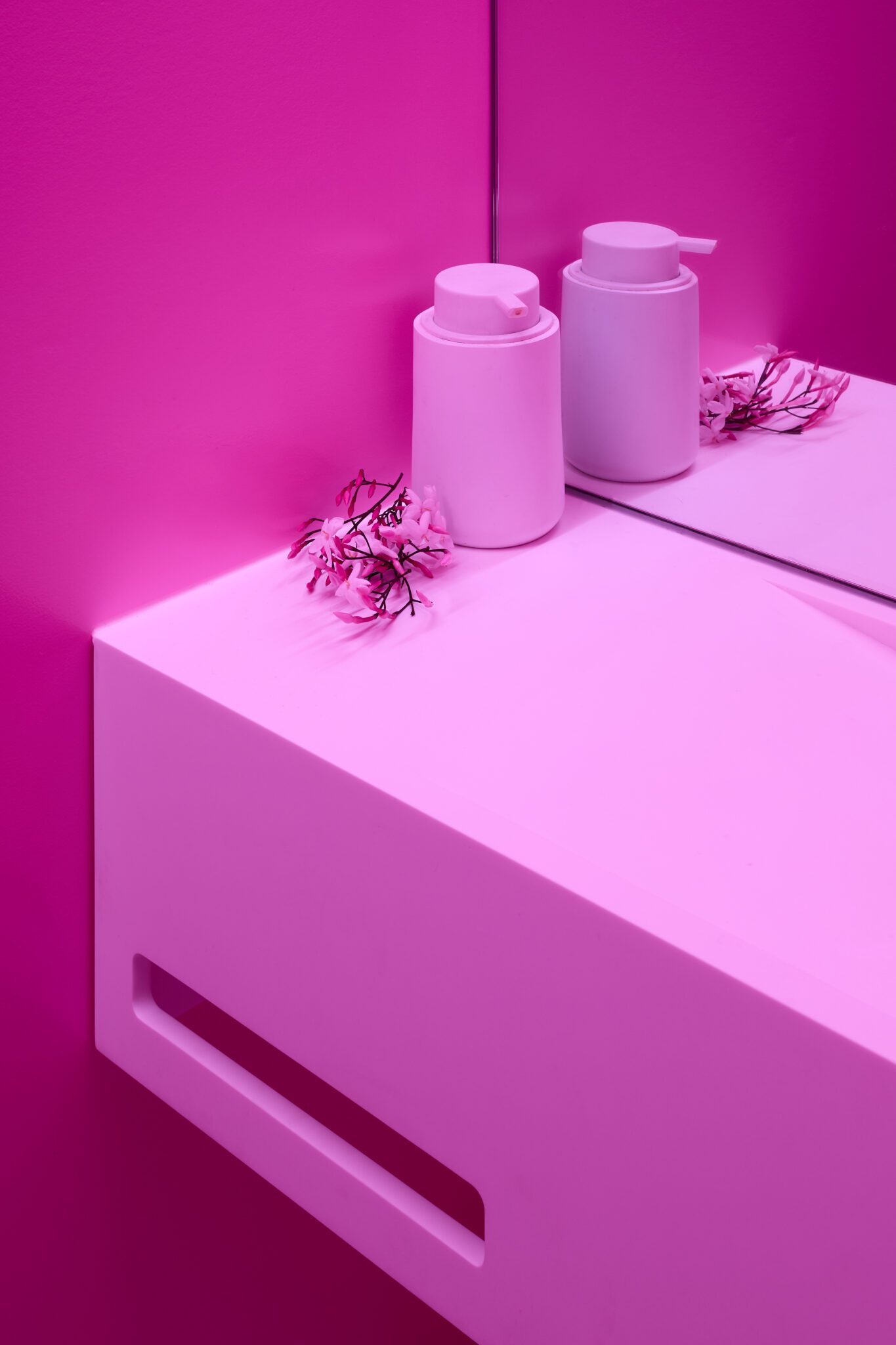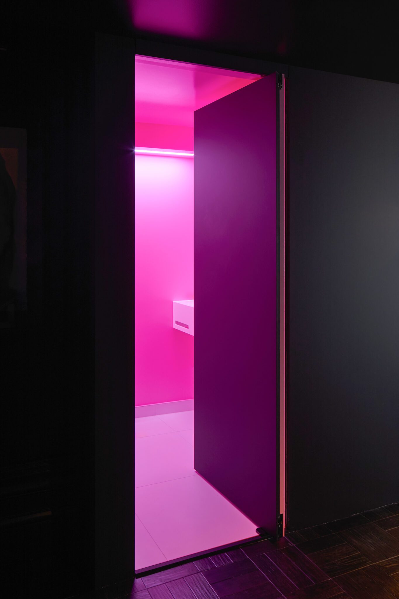 Naith describes the sculptural piece — visible from the street — as somewhat akin to “light graffiti scribble”. Yet, among this dark and cave-like palette full of rather gritty urban allusions, there is a bathroom that explodes in entirely different hues.