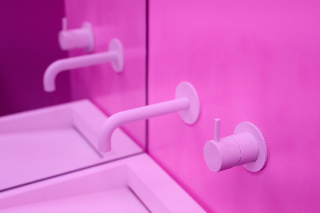 “It’s ballerina pink,” Andrew laughs, when asked about the apartment’s most striking feature. The bathroom walls are painted in a delicate but assertive shade that transforms fittings into “candyfloss” reflections under light.