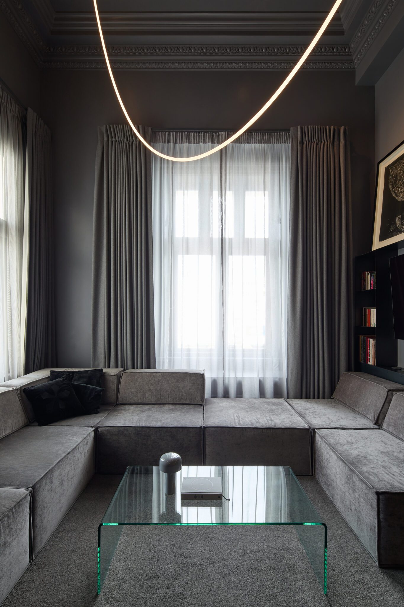 After having survived the threat of demolition, the building was converted into apartments in the 1990s. The external walls, thick stone and concrete, remained untouched. Internally, heritage trims, skirting, and the colour schemes had to be preserved. Beyond that, however, the architects and clients had scope to personalise and reorganise.