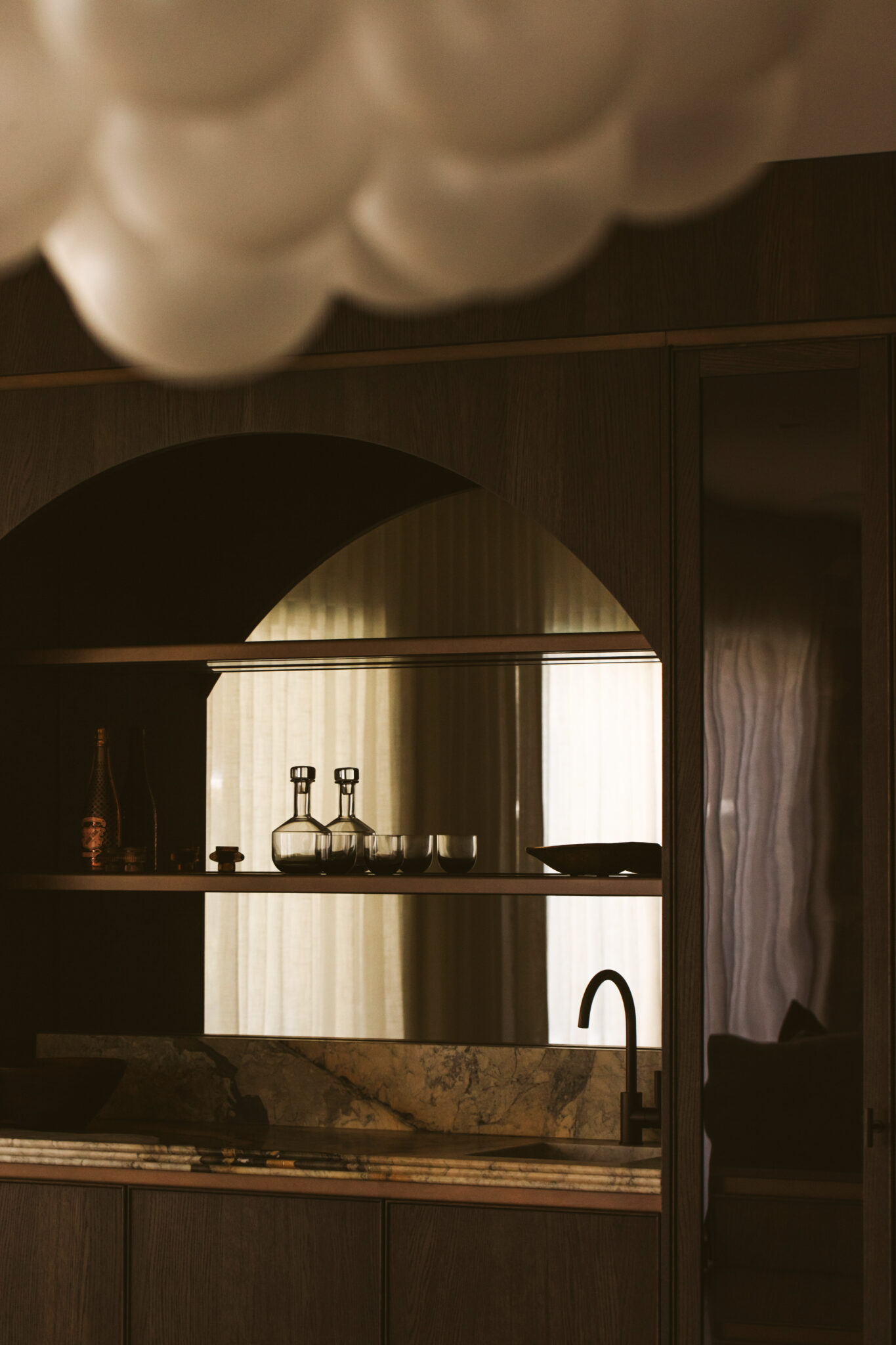 To ground the marble’s drama, the rear bench is dark Dekton, which gently recedes into chocolate-toned cabinetry, curved at either end in a gentle nod to the home’s original stucco arches.